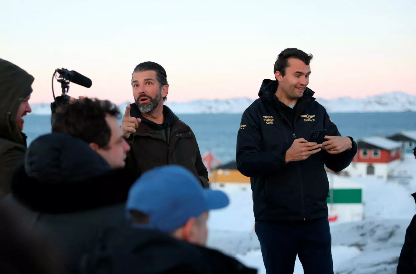 TYDELIG BESKJED: Donald Trumps sønn, Trump Jr. var på besøk i den grønlandske hovedstaden Nuuk i starten av januar 2025, blant annet i følge med den nå avdøde Charlie Kirk. Flere mener at besøket var en tydelig beskjed om at Trump ville ta over Grønland. Foto: Emil Stach/Ritzau Scanpix/Reuters/ NTB