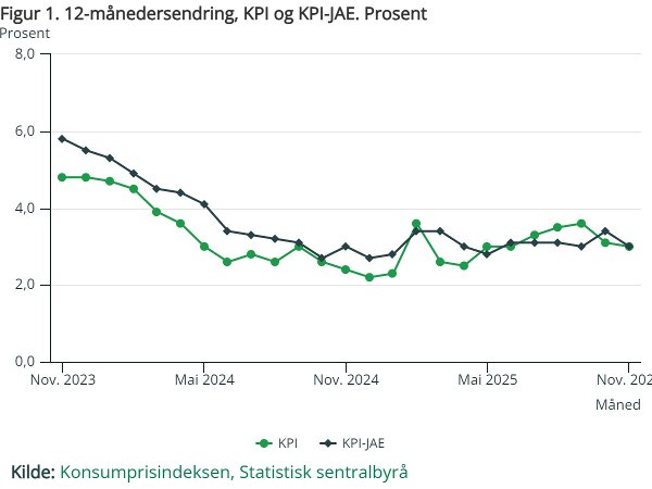 – Detaljene viser i første rekke en reversering av noe av de litt overraskende sterke prisøkningene i oktober – som kan ha vært relatert til prisjusteringer i forkant av salgskampanjene i november – og vi er mer tilbake til utgangspunktet: Den underliggende inflasjonen har fortsatt å svinge rundt 3-tallet, slik vi i grunn har sett siden midten av fjoråret.