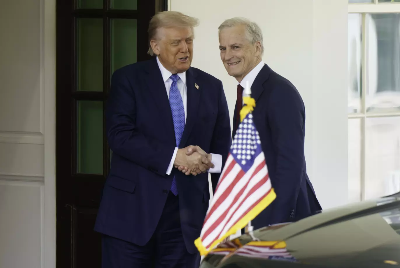 HILSER: Trump hilser på selveste Jonas Gahr Støre i det Hvite hus i april. Foto: Cornelius Poppe / NTB
