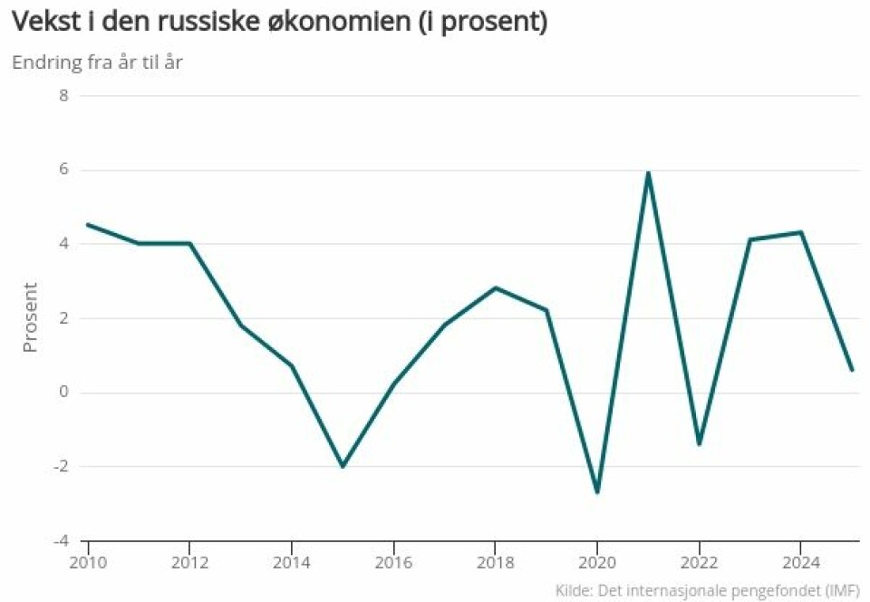 Samtidig går Russland nå mot randen av resesjon, og anslaget for reell vekst i BNP for 2025 er ventet å ligge rundt blodfattige 0,6 prosent, ifølge IMF.