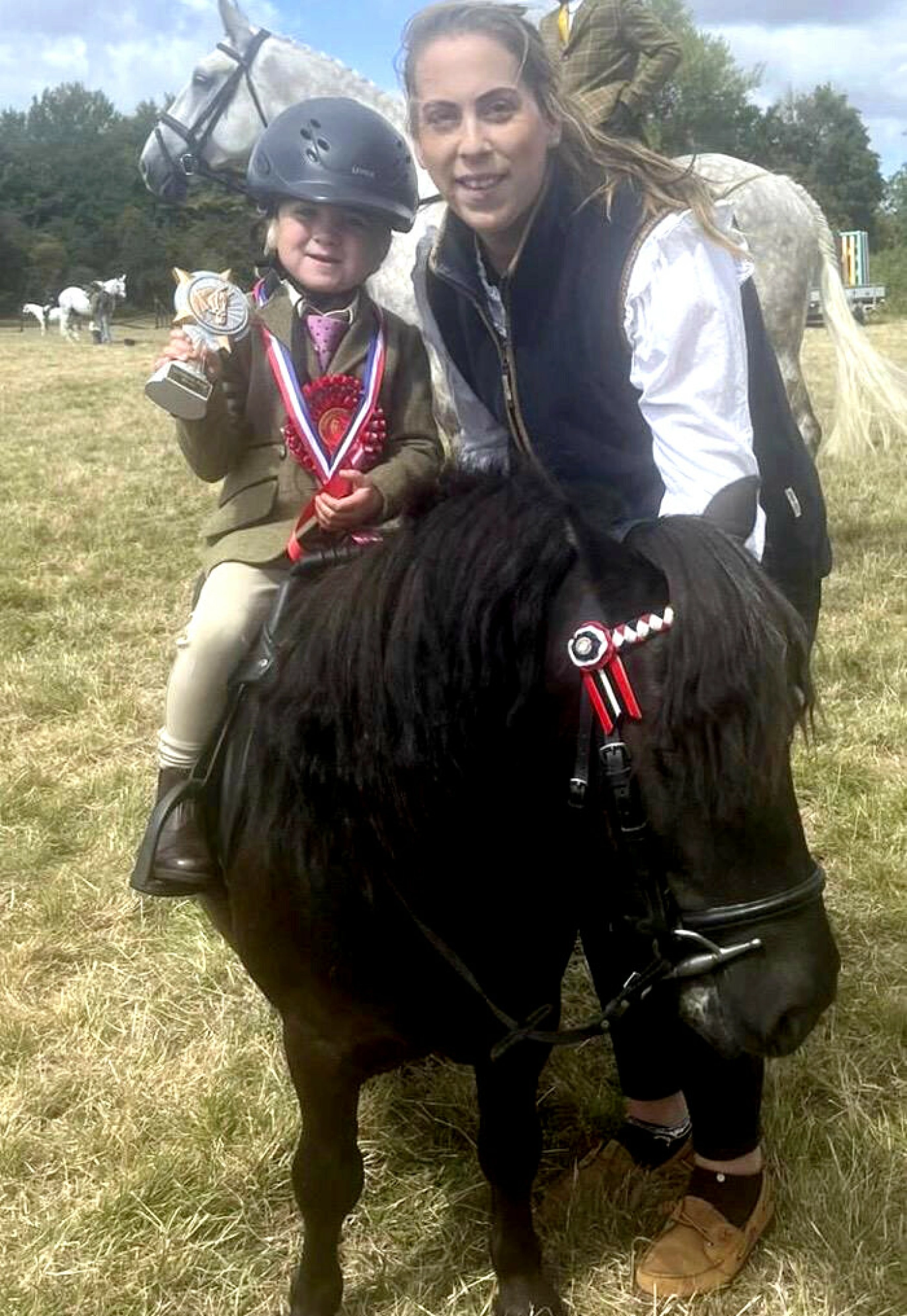 AKTIV: Det er mye Ivy ikke orker – men å sitte på ryggen til en ponni går bra! Foto: Privat