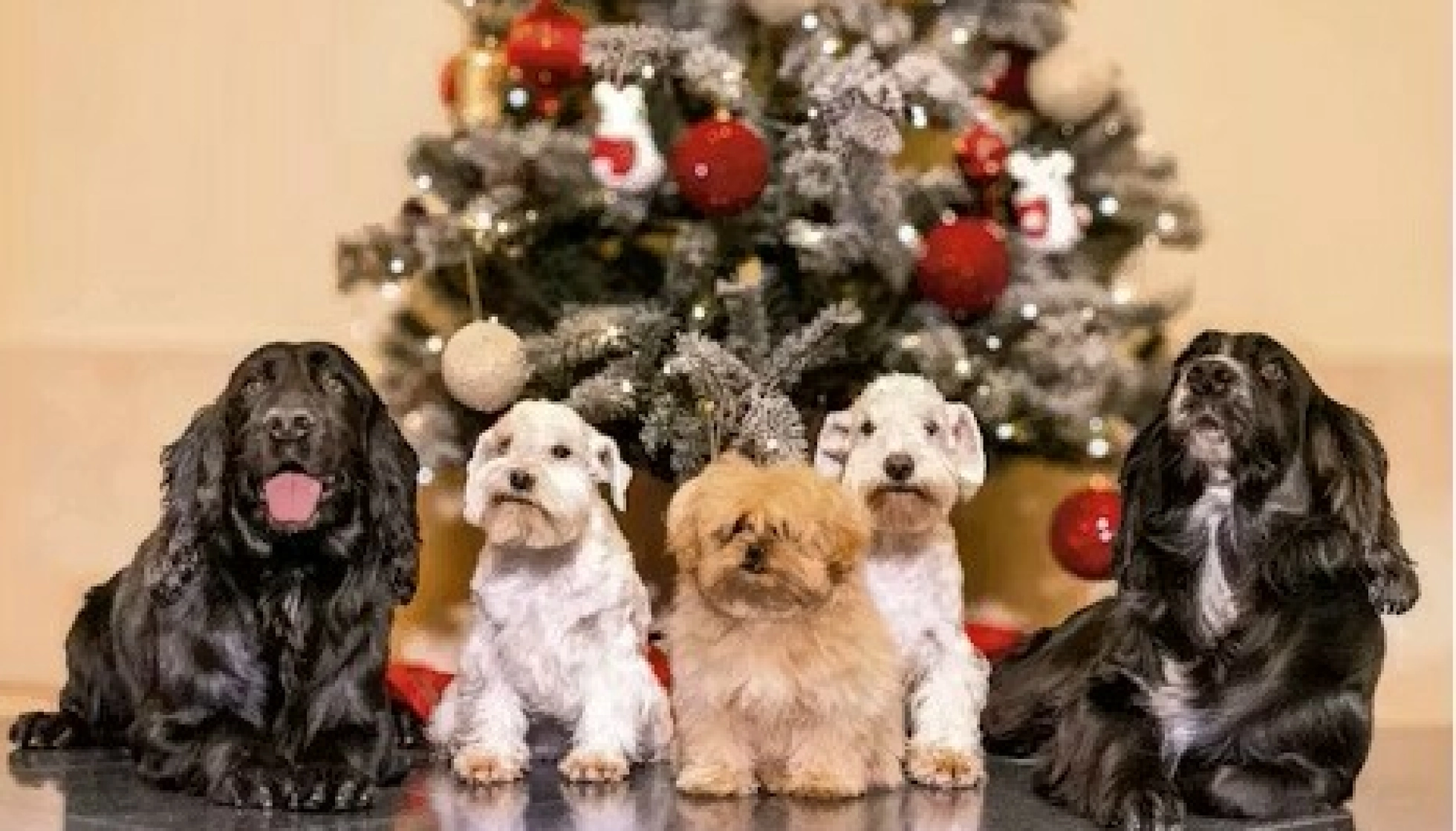 De fem hundene er fotografert foran et juletre, og ifølge det spanske mediet er bildet tatt i dronning Sofias residens i Zarzuela-palasset.