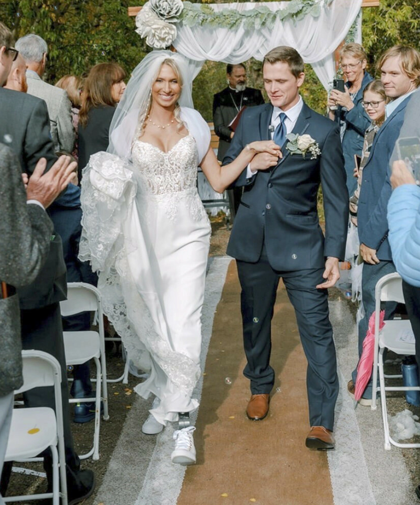 VENNENE HEIET: Lexie og Zach nærmest danset seg ned midtgangen etter å ha sagt ja til hverandre. – Tenk at jeg kunne gå der uten å ha vondt! Det var et mirakel, sier Lexie. Foto: NTB