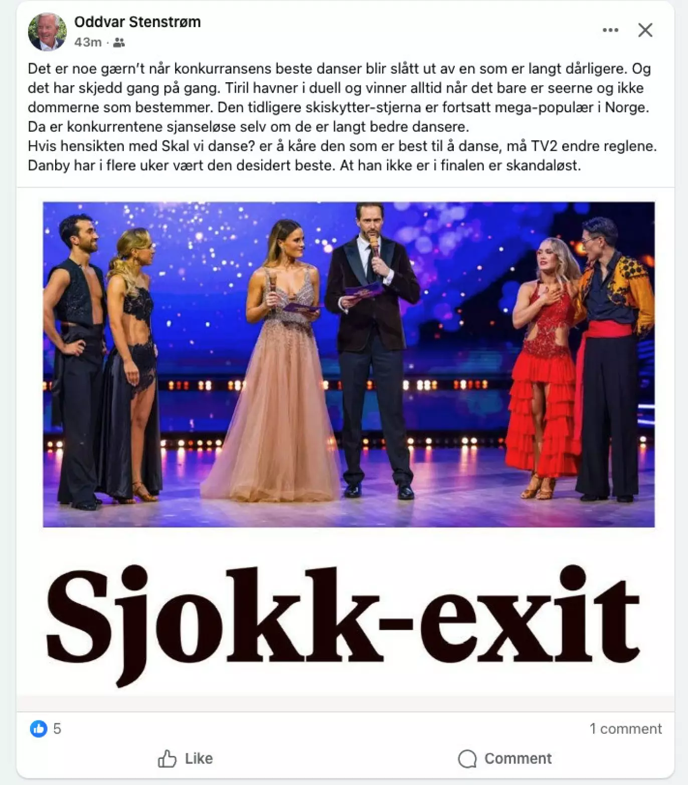 «Hvis hensikten med ‘Skal vi danse’ er å kåre den som er best til å danse, så må TV 2 endre reglene. Danby har i flere uker vært den desidert beste. At han ikke er i finalen er skandaløst», raser han videre.