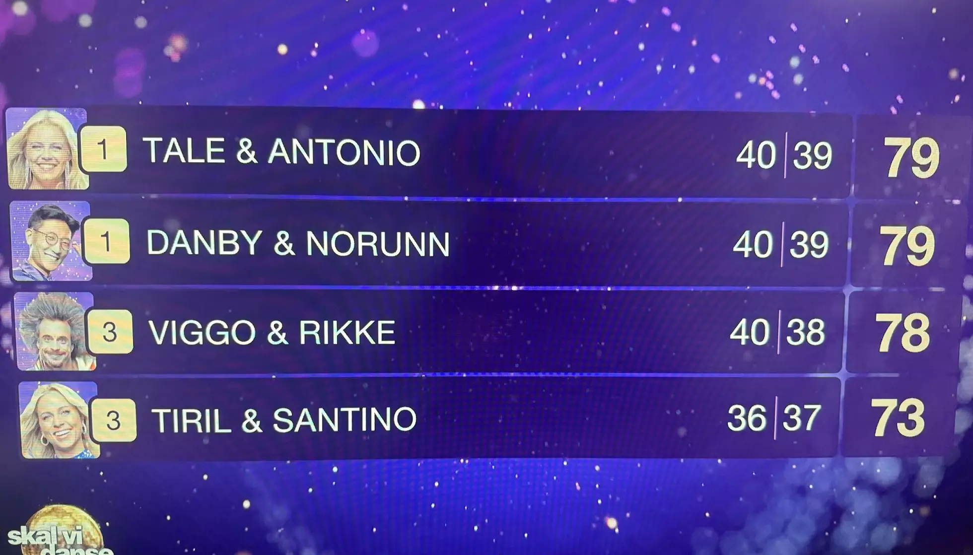 Dommernes resultatliste fra lørdag kveld viser at det ble delt ut mange høye poeng, men at det var Tale Torjussen (20) og Antonio Careri (27) og Danby Choi og Norunn Ringvoll (24) som fikk flest. Ett poeng bak var Viggo Venn (36) og Rikke Lund (29), mens Tiril Eckhoff og Santino Mirenna (31) var fem poeng bak dem igjen.