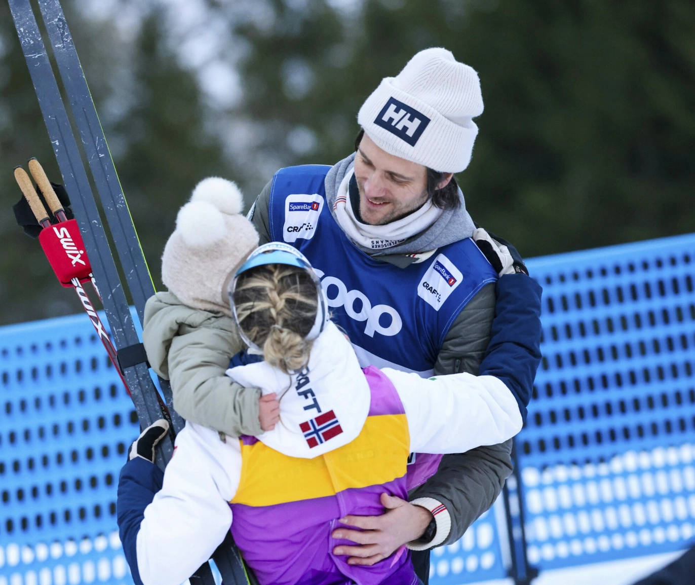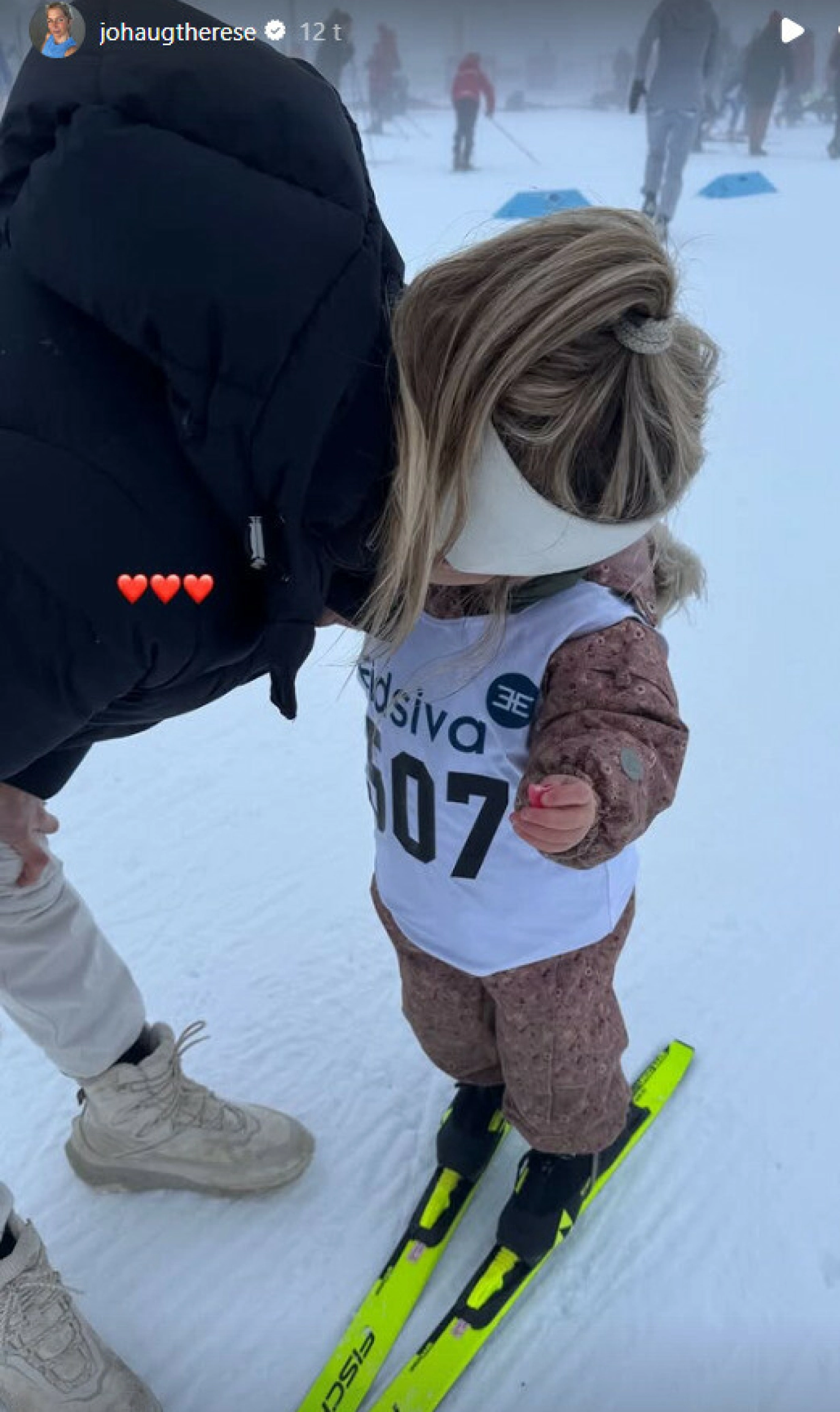 Ett av bildene viser Kristin med startnummer og gule langrennsski ute i løypa, med mamma som gir toåringen en varm klem.