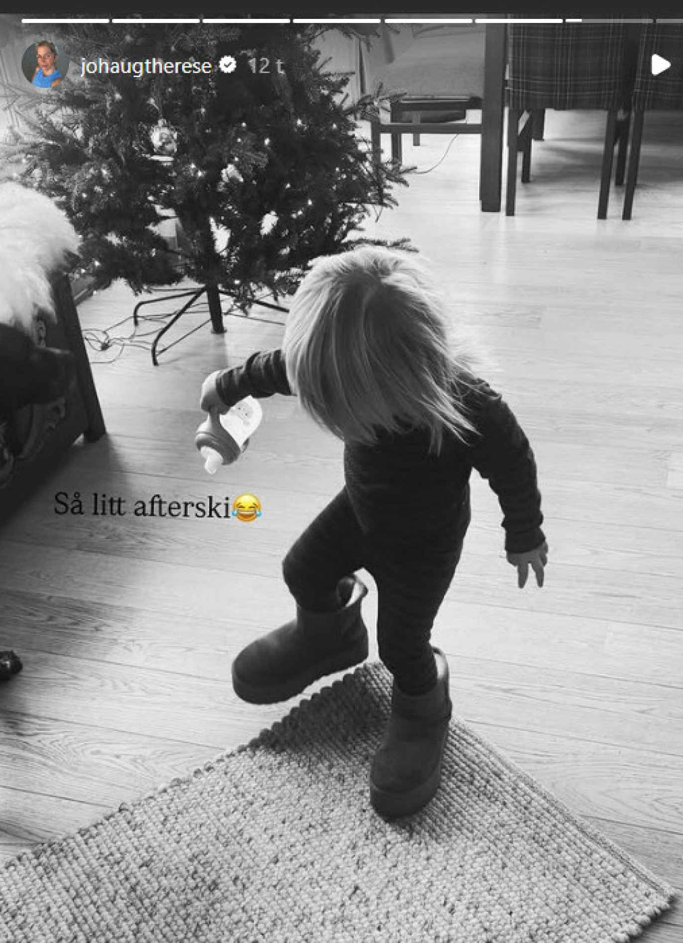 AFTERSKI: Med varme, litt for store sko herjer lille Kristin inne etter skituren – med passende drikke i høyrehånden. Foto: @johaugtherese