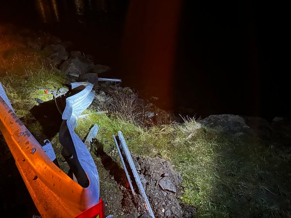 SKADAR: Det er store skadar på autovernet etter at bilen køyrde gjennom det.