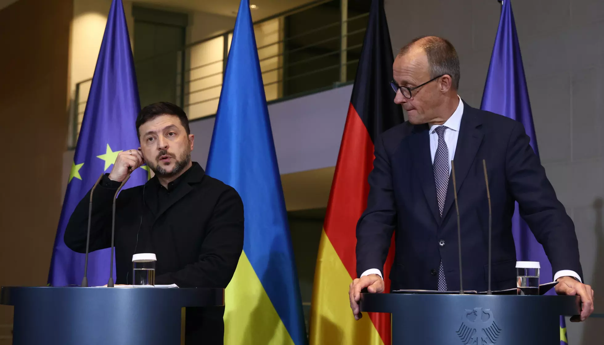 Zelenskyj uttaler under en pressekonferanse i Berlin at han ikke trodde at USA ville kreve noe når det kommer til Ukrainas territorier.