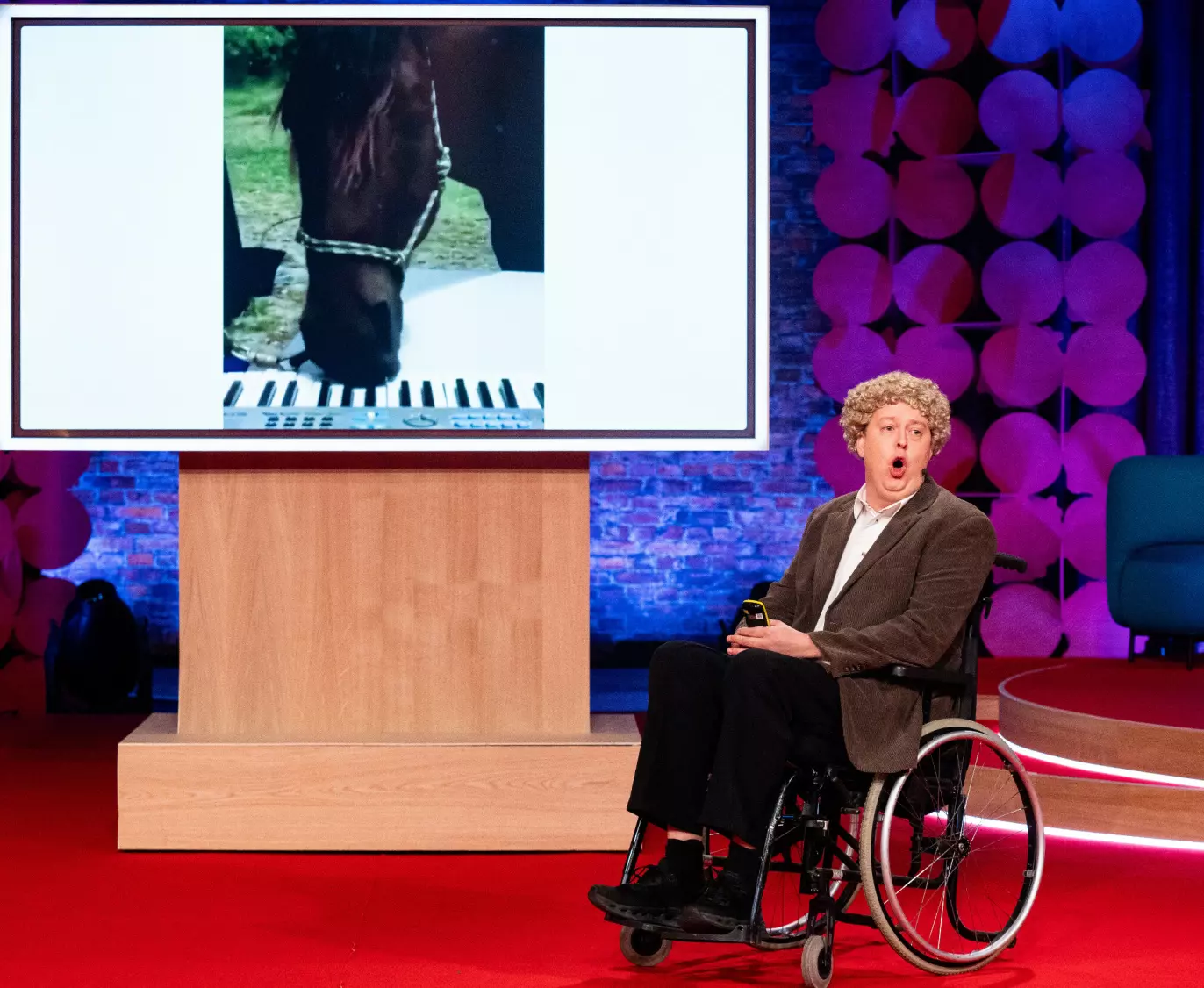 SMAKEBIT: Deltakerne holder tilsynelatende ikke tilbake når de skal prøve å få publikum til å le. Her er komiker Henrik Fladseth avbildet i en rullestol med parykk på hodet. Foto: NRK