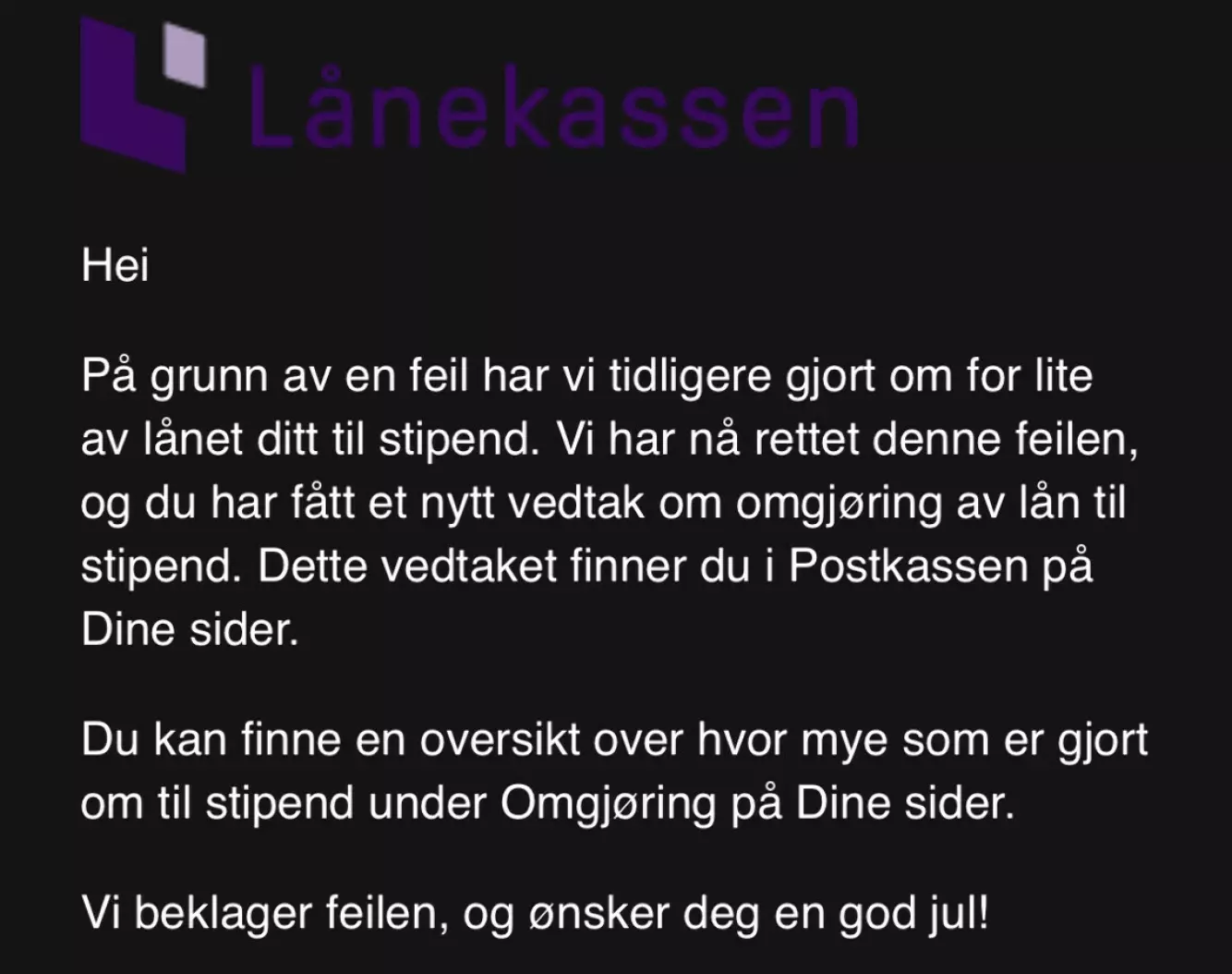 – Vi har nå rettet denne feilen, og du har fått et nytt vedtak om omgjøring av lån til stipend, står det i e-posten som er sendt ut til over 5000 personer.