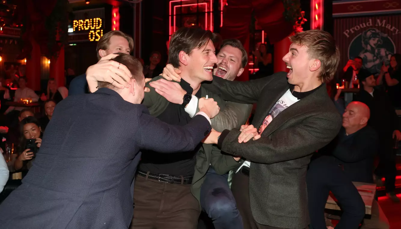 FEIRER SEIER: Her får Magnus feiret seieren sammen med sine venner på finalefesten. Foto: Andreas Fadum / Se og Hør