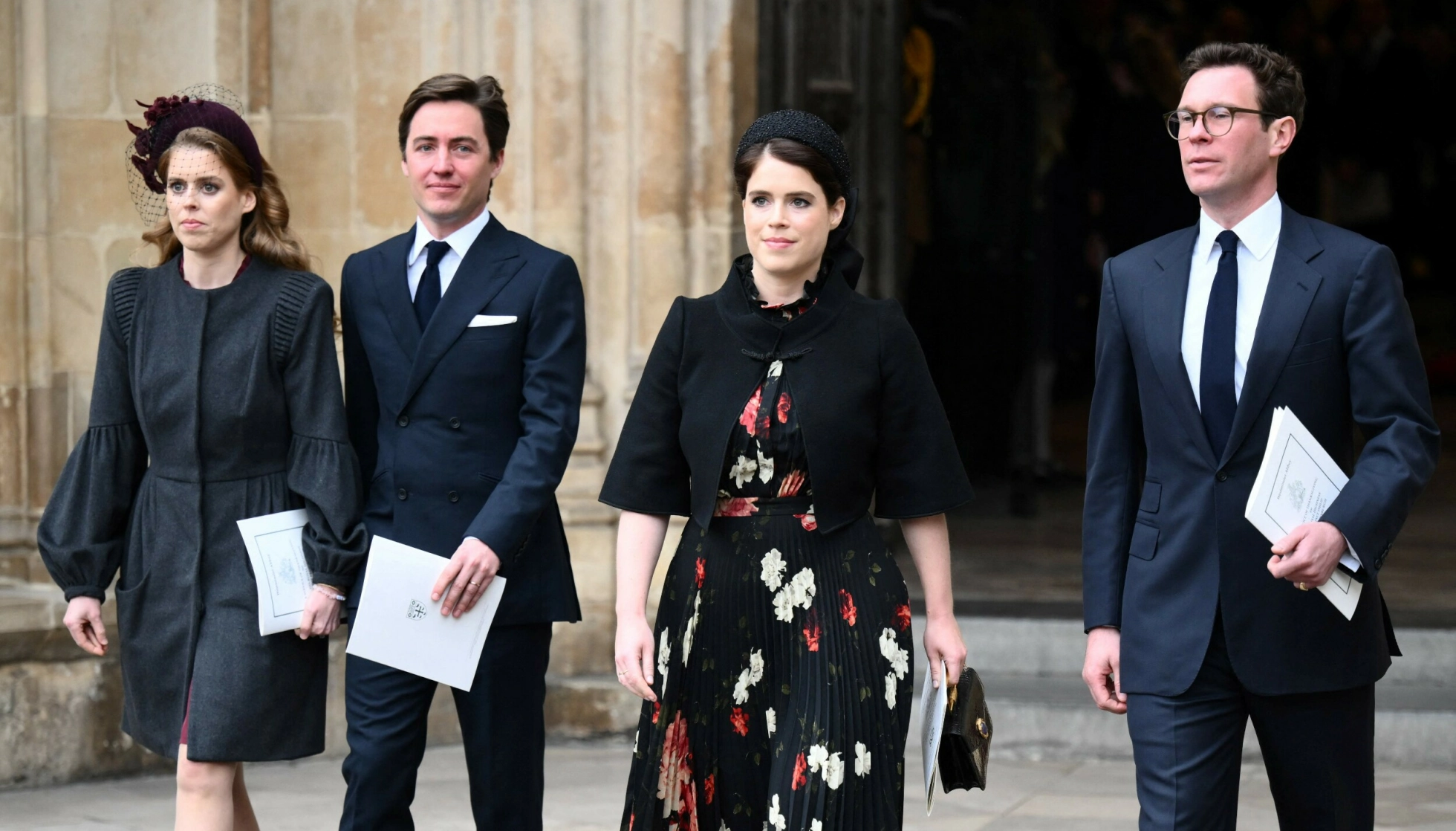 KVARTETT: Princess Beatrice , ektemannen Edoardo Mapelli Mozzi, prinsesse Eugenie og ektemannen Jack Brooksbank etter en minnegudstjeneste for avdøde prins Philip, prinsessenes bestefar. Foto: NTB