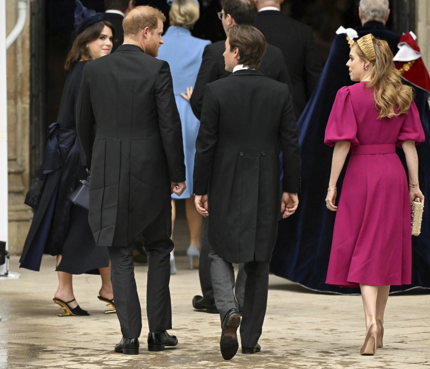 FORTSATT NÆRE VENNER: Prinsesse Eugenie (t.v) og prinsesse Beatrice har fortsatt god kontakt med søskenbarnet prins Harry. Her fra kroningsseremonien til Charles og Camilla i 2023. Foto: NTB