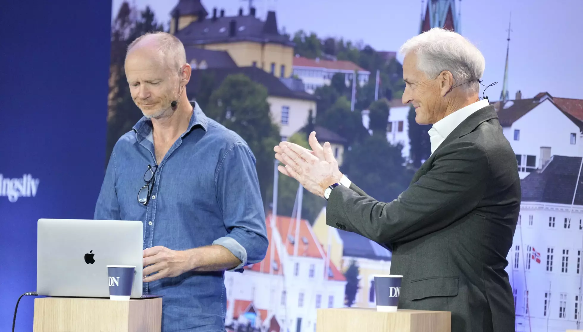 IKKE BARE KOMIKER: Harald Eia påpeker at han ikke bare er komiker, men også formidler. Her er han i en debatt på Arendalsuka i 2024, sammen med statsminister Jonas Gahr Støre. Foto: NTB/Heiko Junge