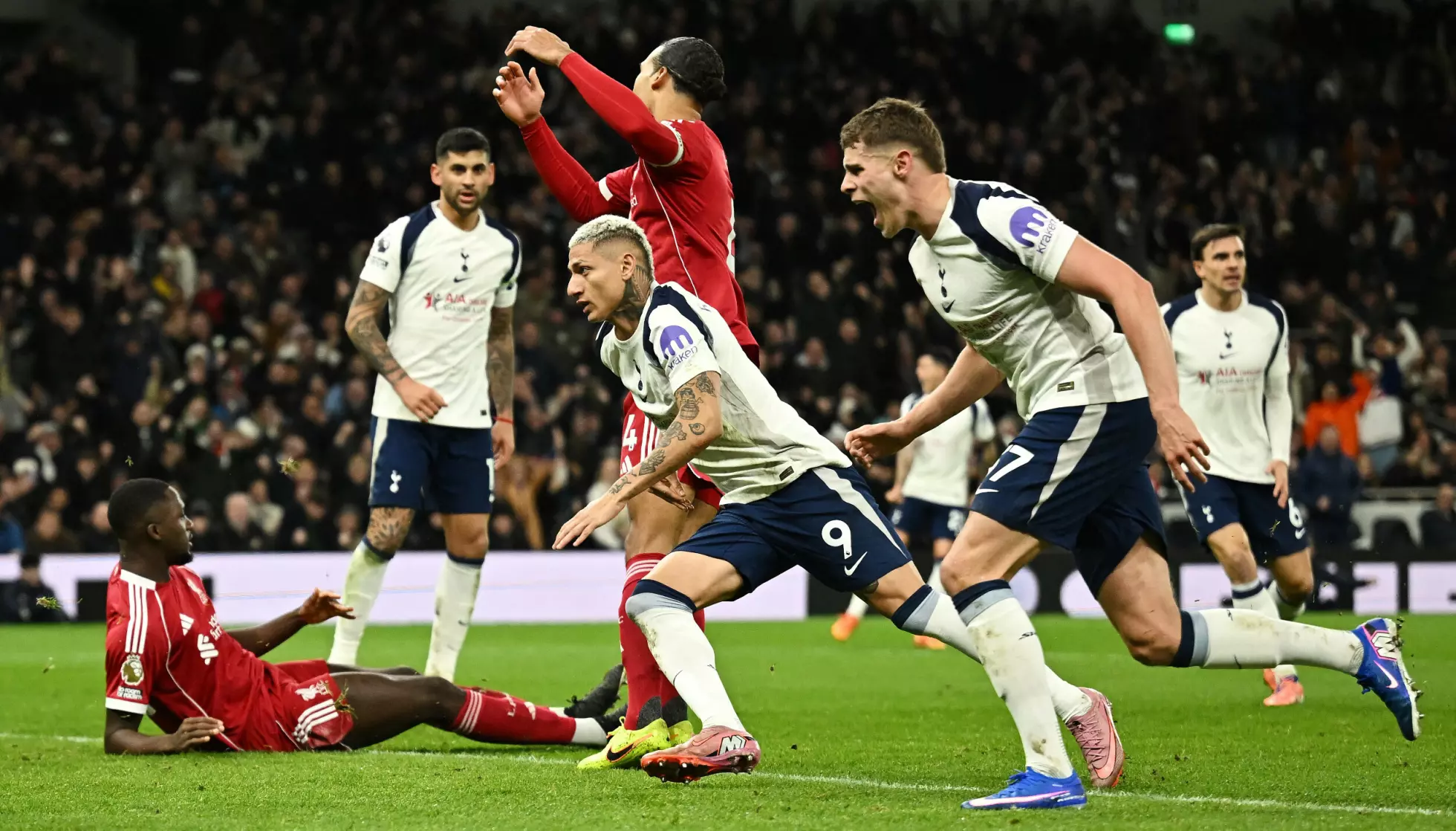 Liverpool vinner mot Tottenham i London etter en dramatisk avslutning. 56 minutter ut i oppgjøret sendte Alexander Isak Liverpool opp i ledelsen, men ble taklet av Tottenhams Micky Van de Ven idet han skjøt.