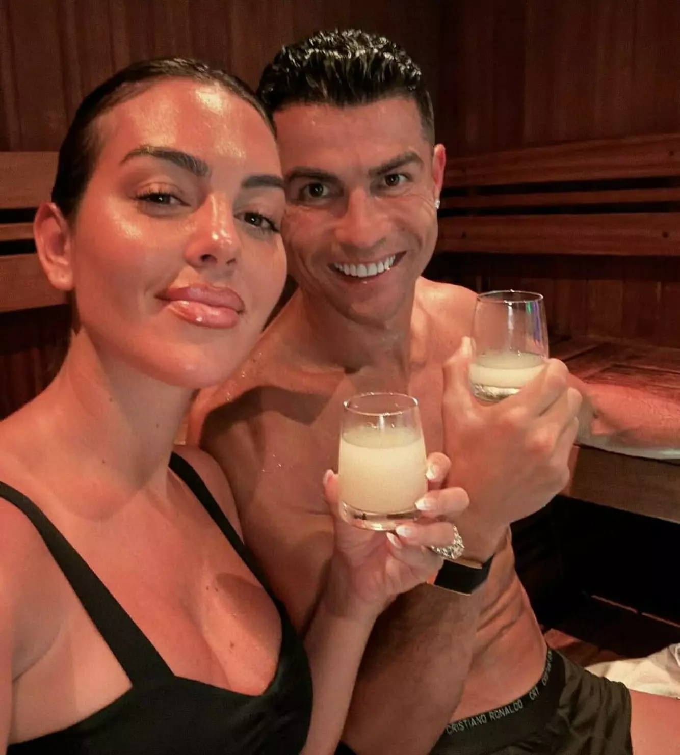 FORNØYDE: Cristiano Ronaldo og kona Georgina nyter et øyeblikk i badstua, der superstjerna bruker varmen som del av sin toppidrettstrening. Foto: cristiano / X