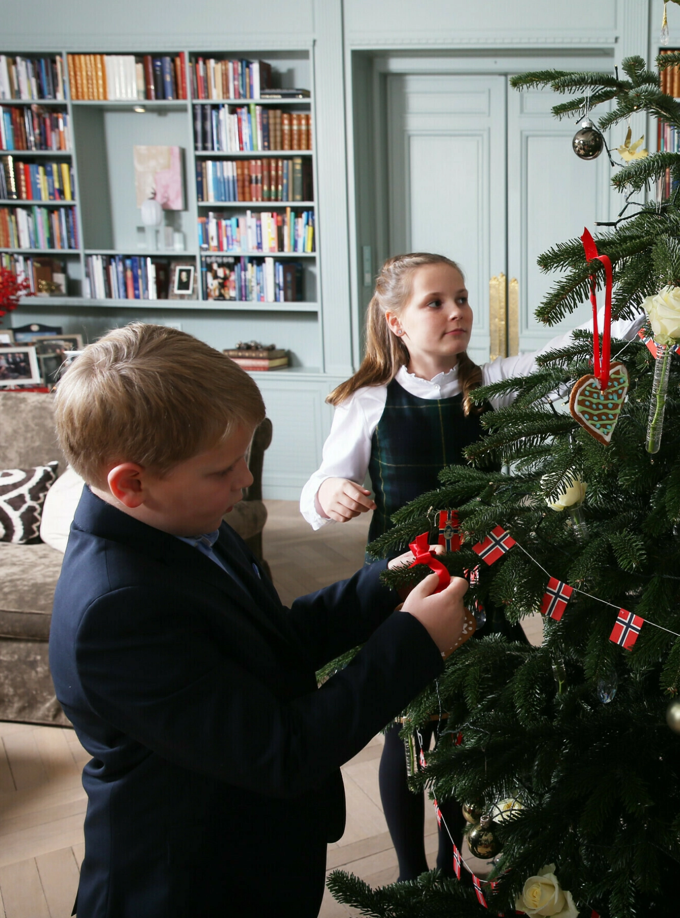2015: Også Skaugum må pyntes til jul. Her er lille prinsesse Ingrid Alexandra og prins Sverre Magnus i 2015, hvor de pyntet juletreet med pepperkakehjerter. Foto: Lise Åserud / NTB