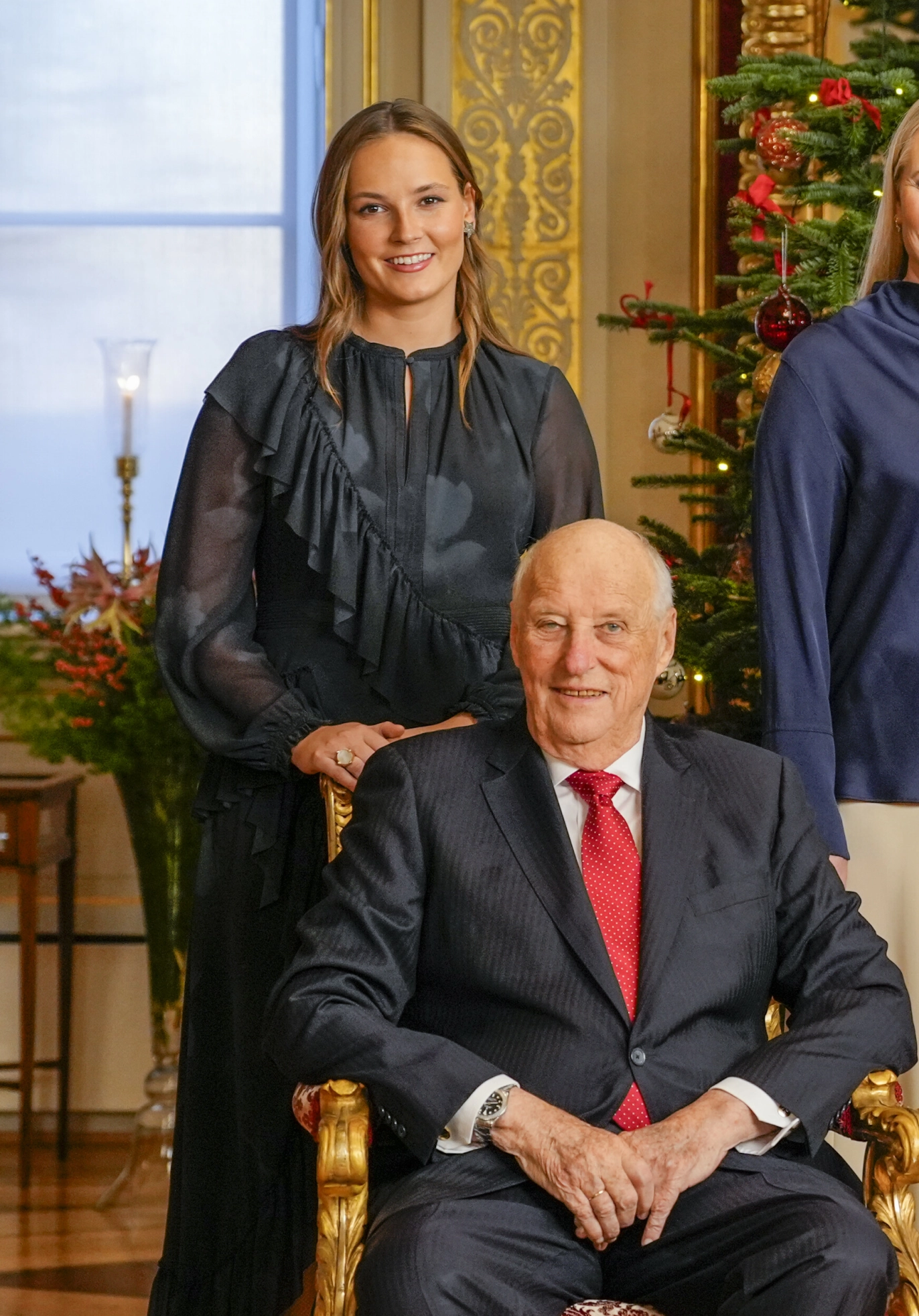 JULEN ER HER: Kongefamilien er svært glad i julen. Her smiler prinsesse Ingrid Alexandra og kong Harald til kamera u nder den offisielle julefotograferingen i 2025. Foto: Lise Åserud / NTB