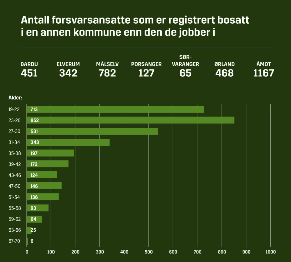 Forsvarets forum og Kommunal Rapport har bedt Forsvaret om tall på personer som jobber i Sør-Varanger, Porsanger, Bardu, Målselv, Ørland, Åmot og Elverum, men ikke har meldt flytting. Vi har bedt om at ansatte med pendlerstatus tas ut av statistikken.