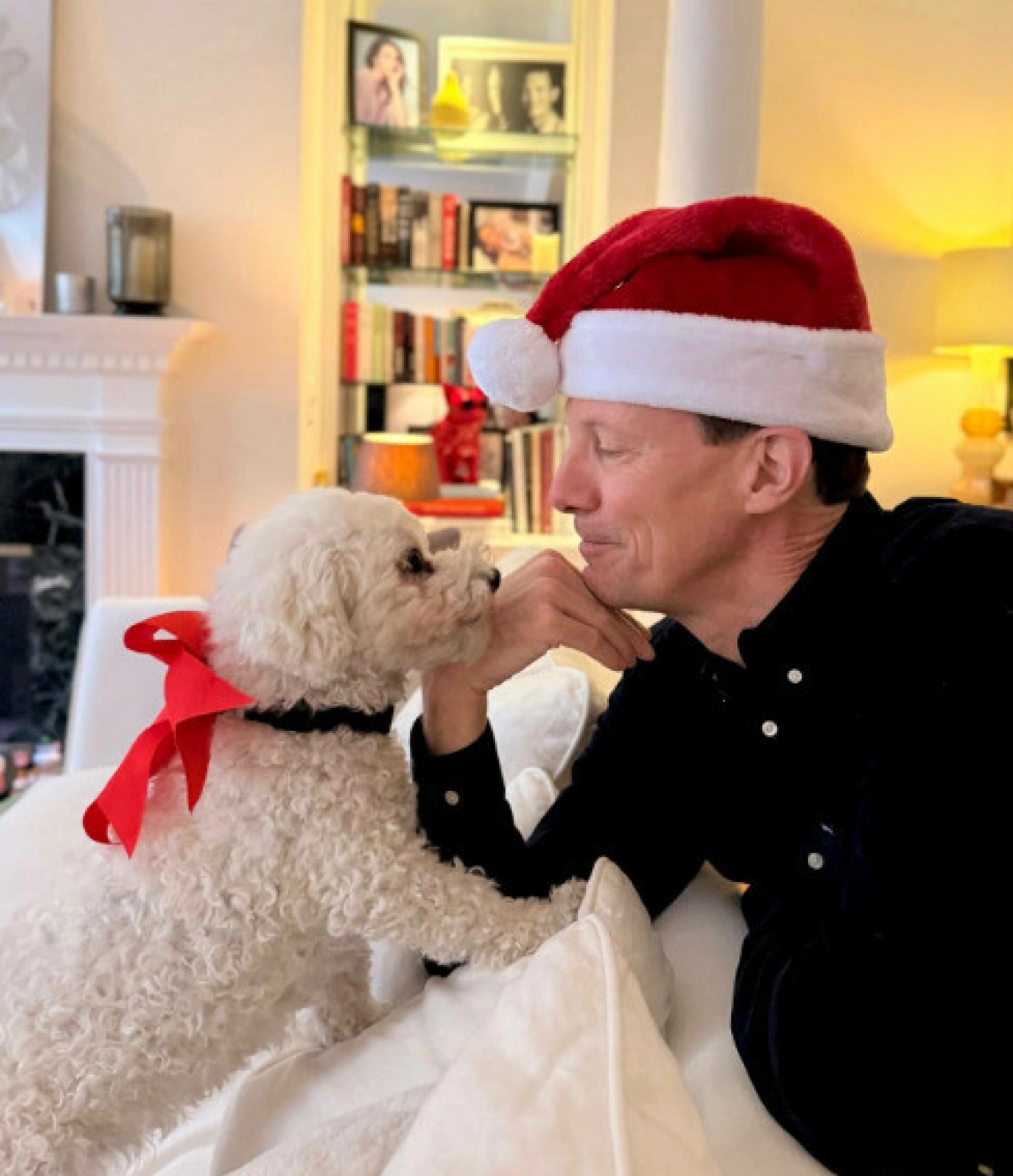 På ett av bildene smiler prinsen bredt med nisselue på hodet, mens familiens firbente venn har fått en rød sløyfe rundt halsen.