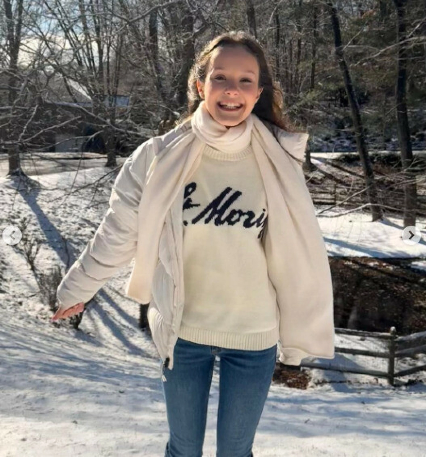 Komtesse Athena (13) smiler bredt i snøhvit genser, jakke og skjerf.
