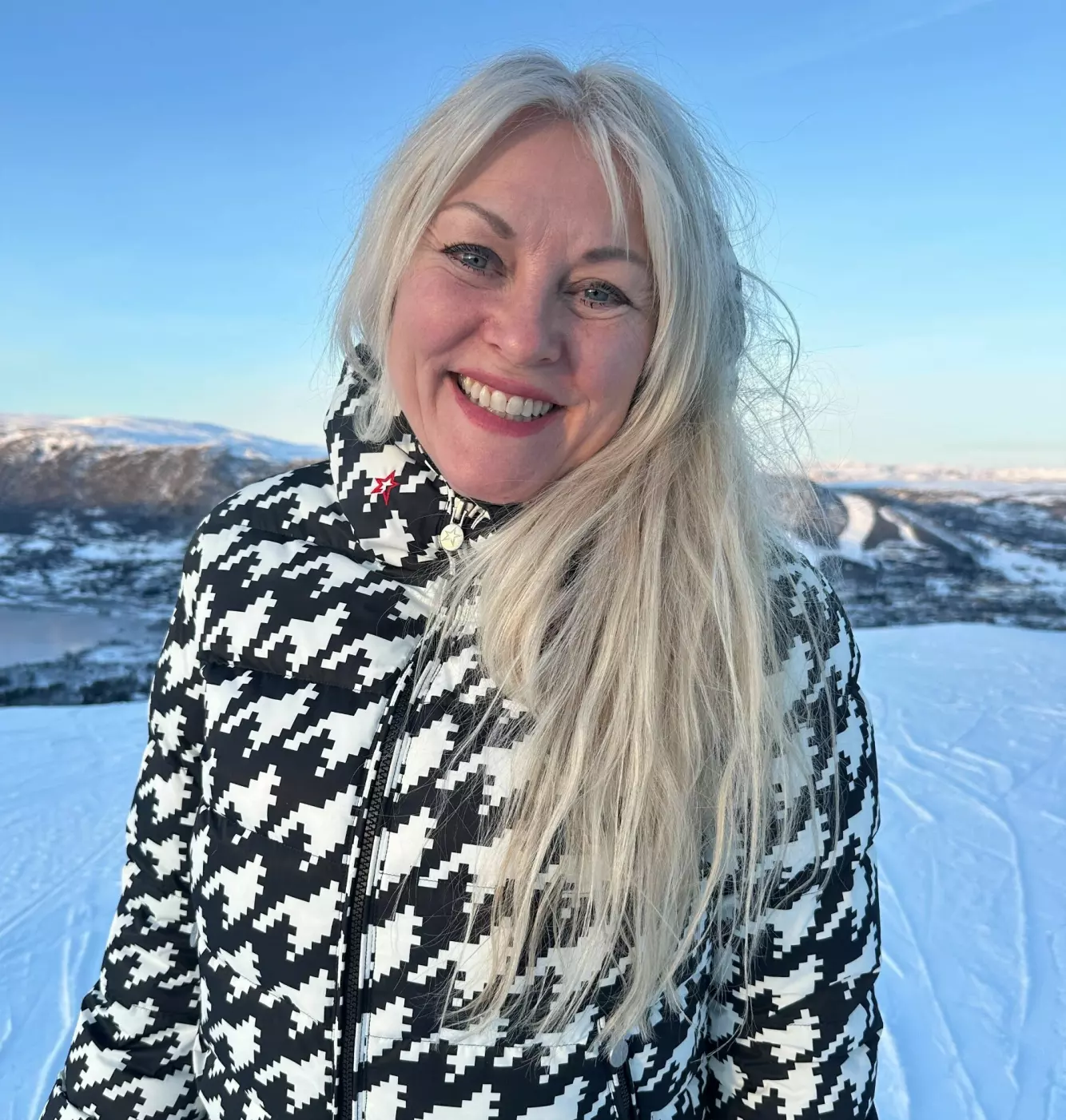 GLAD I JULA: Eli Kari Gjengedal er klar for jul i den norske fjellheimen. Her er hun på Vaffeltoppen på Geilo. Foto: Privat