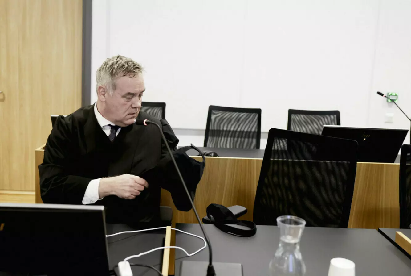 FRAVÆRENDE: Artistens forsvarer Jørgen Riple og stolen hvor klienten hans skulle ha sittet. Foto: Jørn H. Moen
