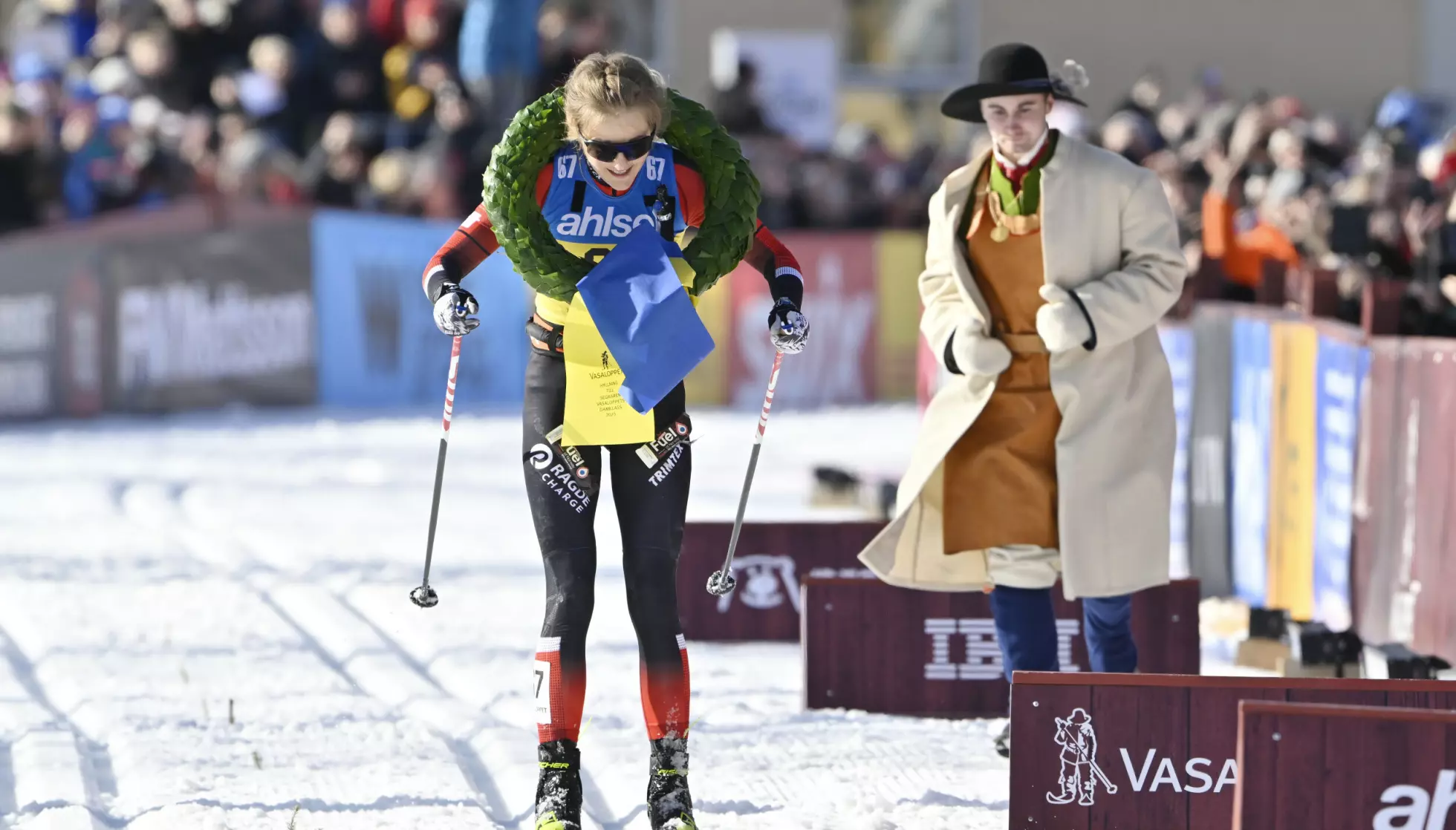 SJOKOGLAD: Stina Nilsson er god på ski og glad i konfekt. Bildet er fra da hun vant Vasaloppet i mars i år. Foto: AP