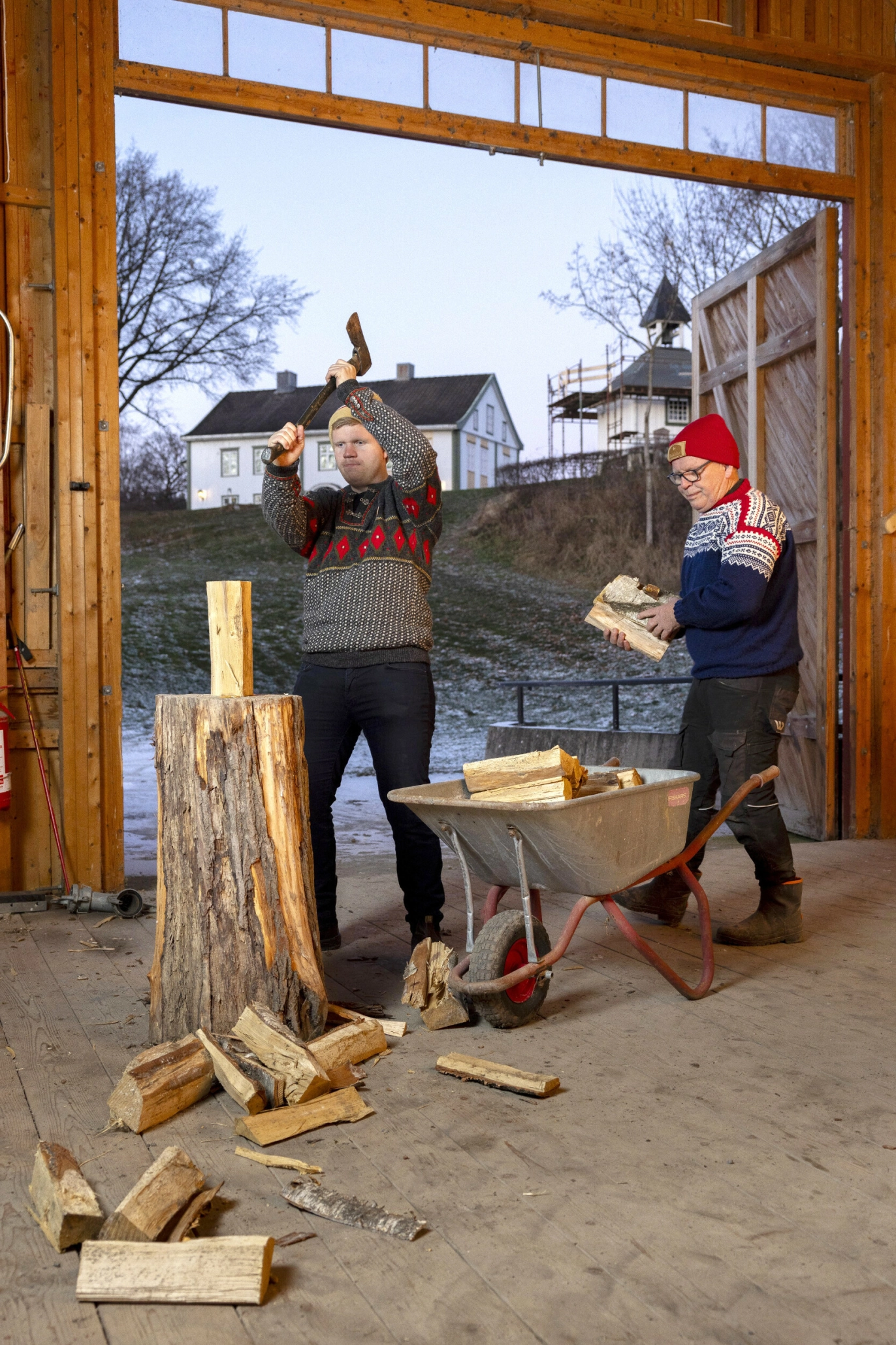 FYRER MED VED: Ole og Ole Simen er et godt team på gården – også når veden kløyves og stables. Foto: Espen Solli