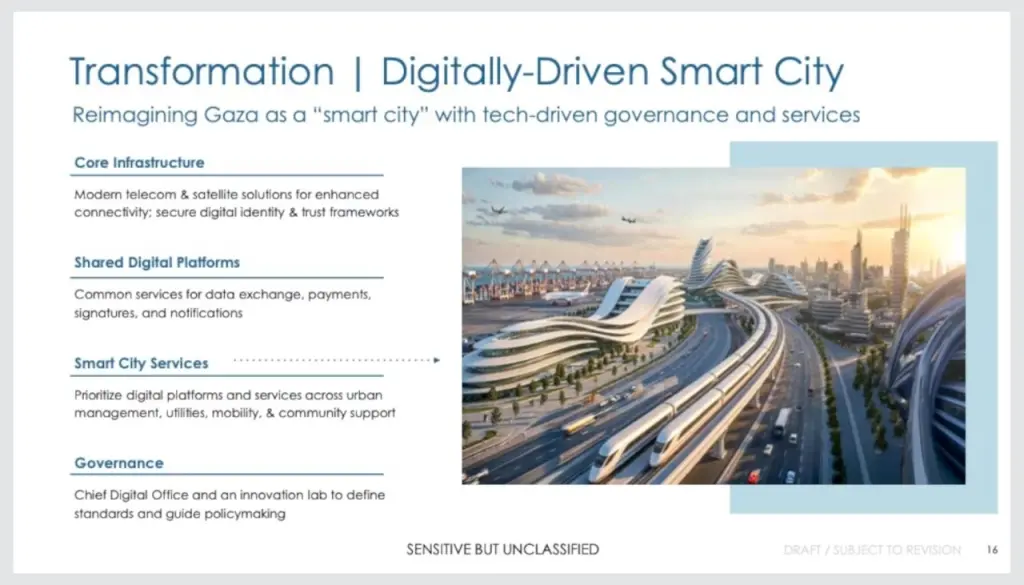 Prosjektet presenteres i et 32 sider langt PowerPoint-dokument, merket «sensitive but unclassified», med visualiseringer av høyhus langs kysten, luksusresorter, høyhastighetstog og AI-optimaliserte strømnett. Ifølge utkastet, som Wall Street Journal har fått tilgang til skal Gazas innbyggere tas «fra telt til toppleiligheter» og «fra fattigdom til velstand».
