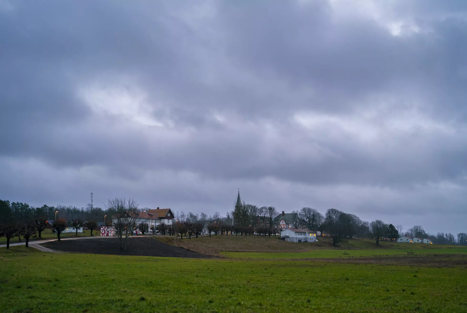 Kirka på Bastøy reiser seg i grå stein og rød mur sentralt på øya.