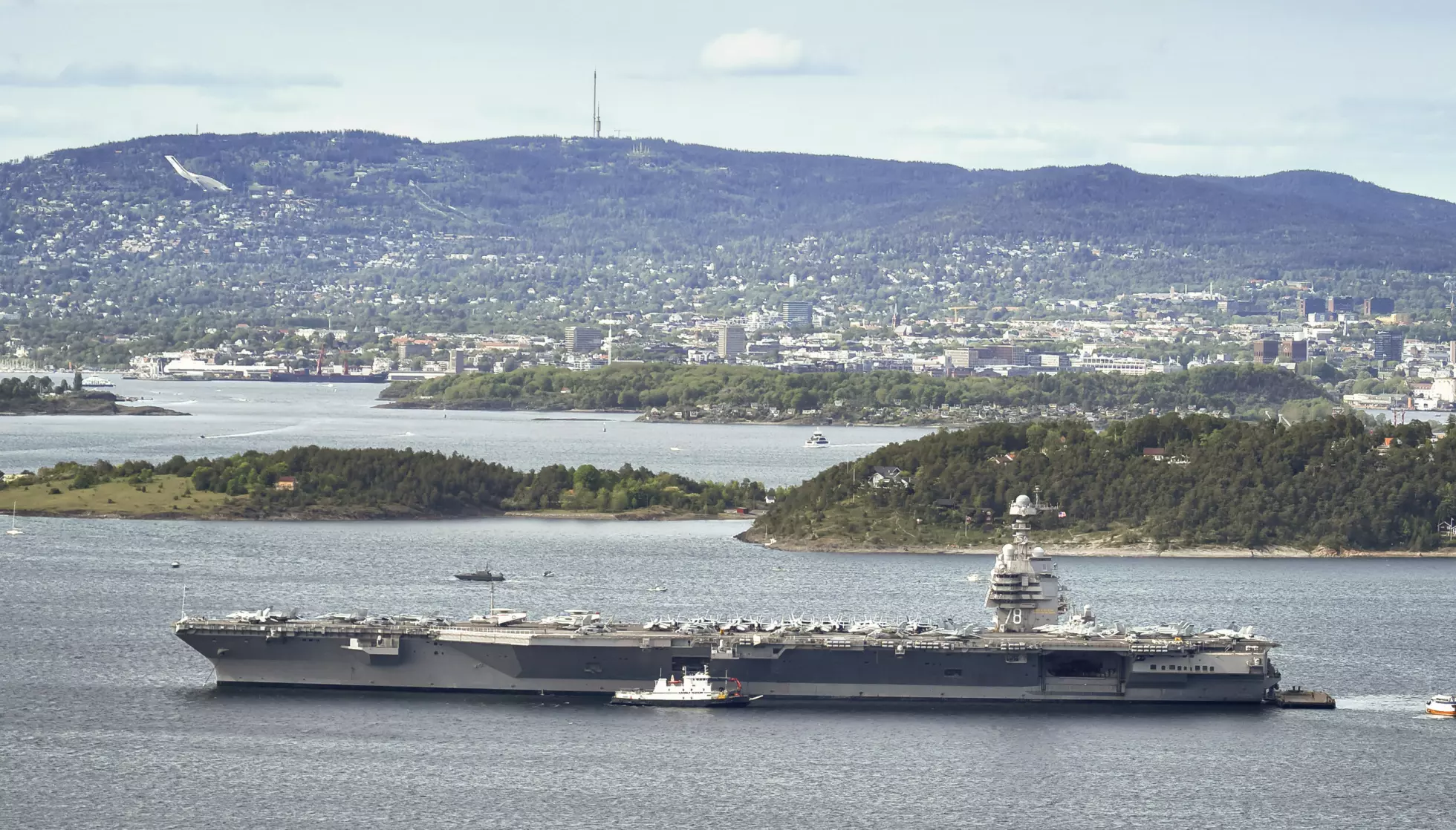 VERDENS STØRSTE: Hangarskipet USS «Gerald R. Ford» i Oslofjorden 25. mai. Foto: Anders Martinsen, UAS Norway