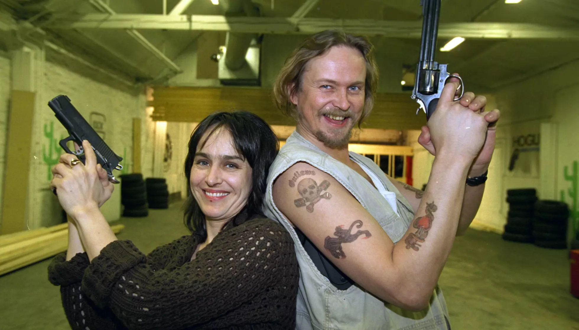 TREFFESIKRE: Pia Borgli og Dennis Storhøi instrueres i skyting av Volfgang Wedde som prøve foran teater-thilleren «Popcorn» i 1997. Foto: Tom Martinsen