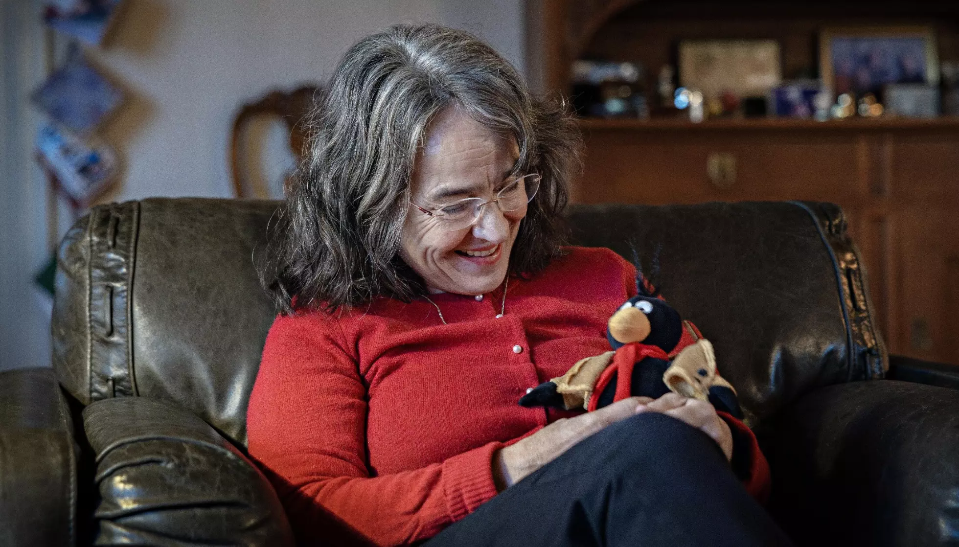 På bordet inne i stua står det kaffe og småkaker på bordet. I godstolen sitter Pia Borgli (66) – ikledd julerød genser og med en Solan Gundersen-bamse i armkroken.