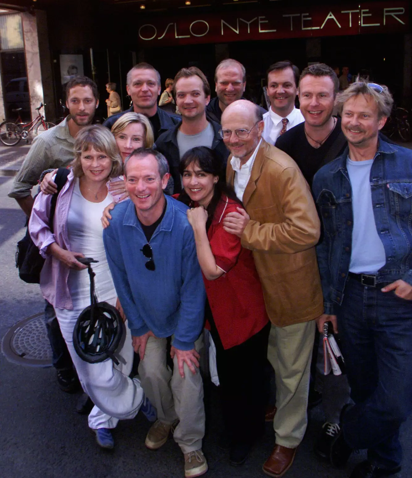 OSLO NYE TEATER: Teatersjef Kjetil Bang-Hansen (i brun jakke) sammen med resten av staben under presentasjonen av høstens repertoar utenfor Oslo Nye Teater i 2001. På bildet , bak fra venstre.: Trond Fausa Aurvåg, Terje Strømdahl, Gard B. Eidsvold, Ingar Helge Gimle, økonomidirektør Svein Torneberg, Geir Kvarme og Dennis Storhøi. Foran fra v.: Birgitte Victoria Svendsen, Helle Haugen, Petter Ness, Pia Borgli og teaterdirektør Kjetil Bang-Hansen. Foto: Morten Holm / NTB