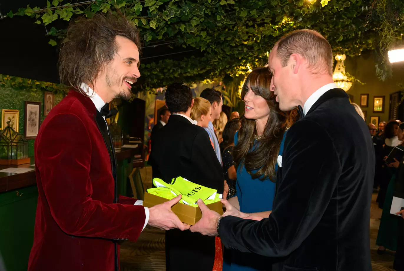 HUSK REFLEKS: Etter seieren i «Britain’s Got Talent» fikk Viggo Venn underholde den engelske kongefamilien. Her overrekker han en refleksvest kronprinsparet William og Kate. Foto: ITV