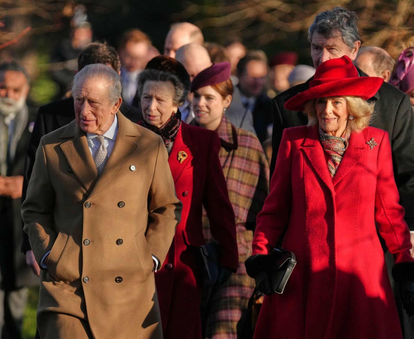 I SOLA: Kong Charles, prinsesse Anne, prinsesse Beatrice og dronning Camilla (78) var alle på plass første juledag. Foto: Jon Super/AP/NTB