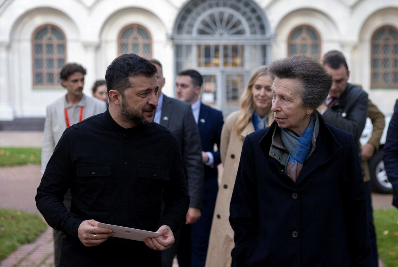 OVERRASKET: Prinsesse Anne overrasket mange da hun reiste på besøk til Ukraine i slutten av september. Her sammen med president Vlodymyr Zelensky. Foto: Thomas Peter/NTB