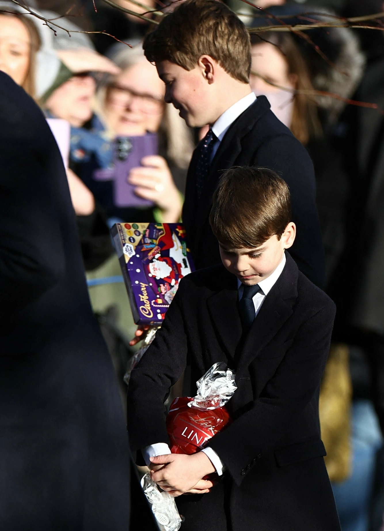 EGG: Kongefamilien mottok gaver fra de fremmøtte. Prins Louis (12) og lillebror prins George (7) i front fikk begge velsmakende gaver. Foto: Henry Nicholls / NTB