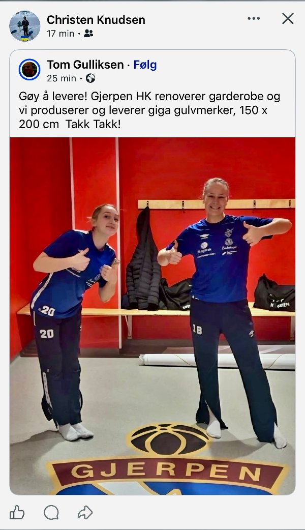 – Det har blitt så flott her. Jeg føler at jeg kan levere det jeg er god på; synlighet og tydelighet. Og her hadde Gjerpen-jentene pusset opp garderoben sin, og dette er en gladsak – sammen med mange andre glade og gode historier etter den dårlige hendelsen i høst. Jeg fikk lov til å montere dette gulvmerket i ordentlig kvalitet i Gjerpen-garderoben. Så hver gang jentene skal spille kamp, så er jeg på gulvet, sier han og ler godt.