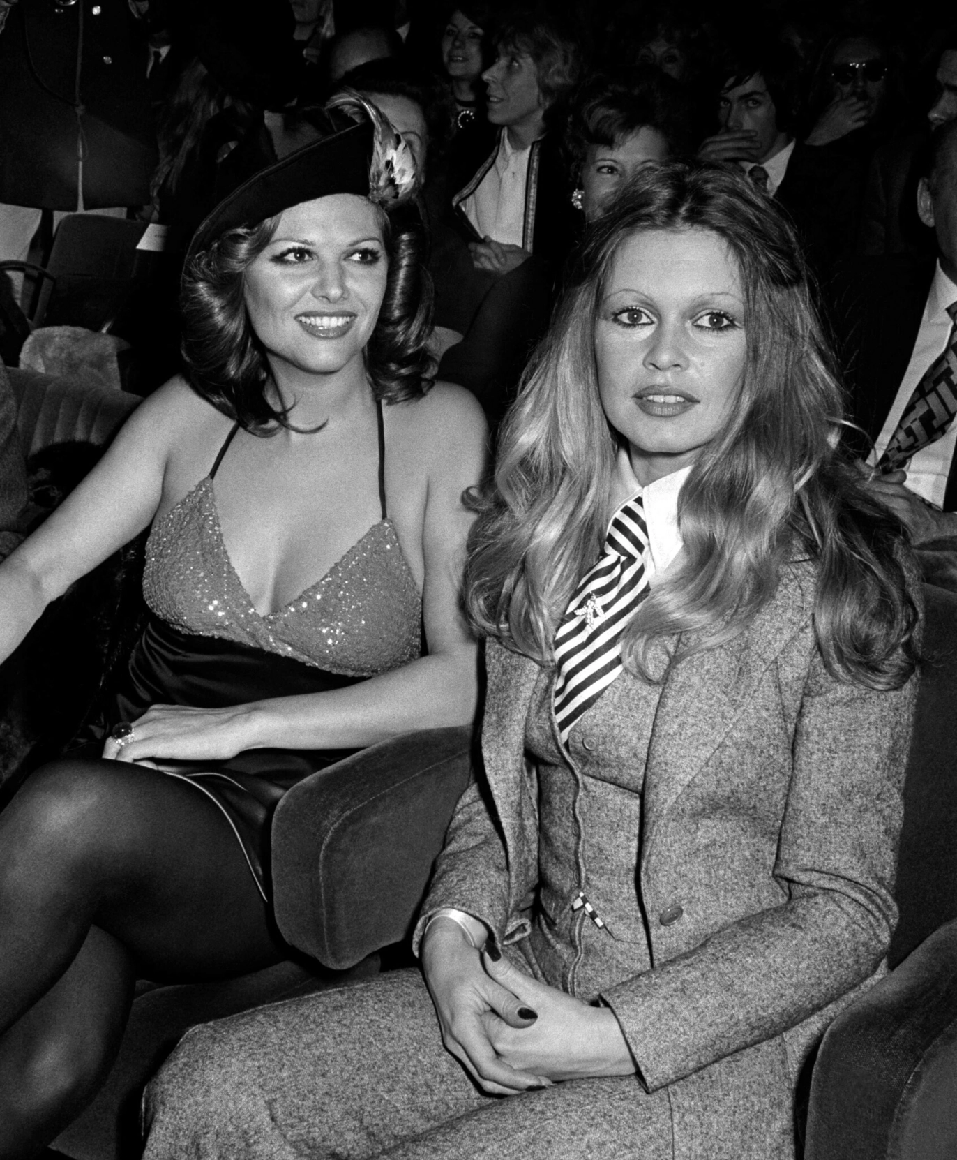 Den franske skuespillerinnen Brigitte Bardot (høyre) og den italienske skuespillerinnen Claudia Cardinale (venstre) på premieren av filmen «Les Petroleuses» i 1971. Foto: AFP / NTB