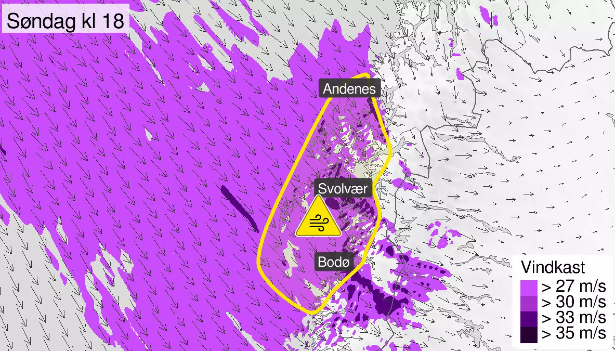 Fra søndag ettermiddag gjelder et eget gult farevarsel om kraftige vindkast for deler av Nordland, der det advares om kraftige vindkast mellom 27 og 33 meter i sekundet.