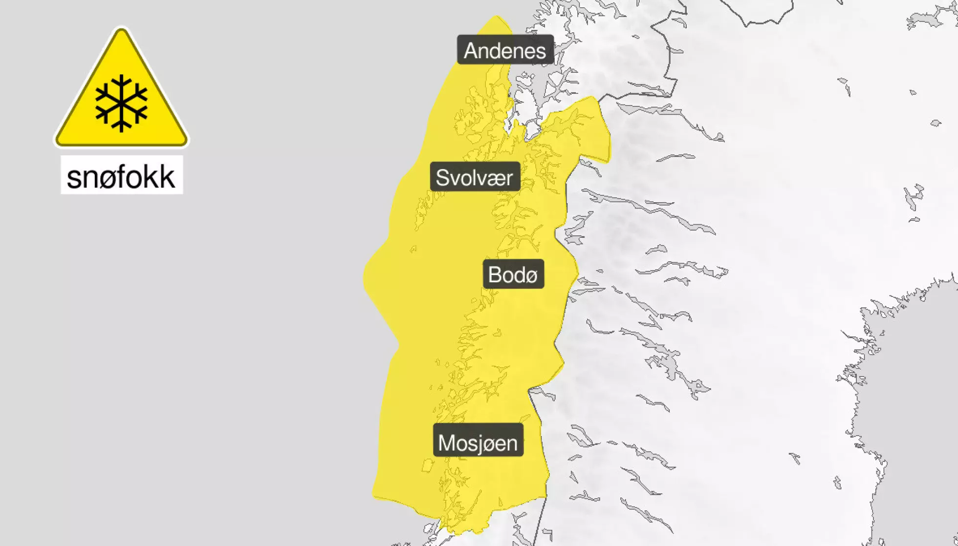 - Flere gule farevarsler er sendt ut for kraftig snøfokk i Finnmark, Troms og Nordland, samt snøfarevarsel på Helgeland, i Nord-Troms og Trøndelag.