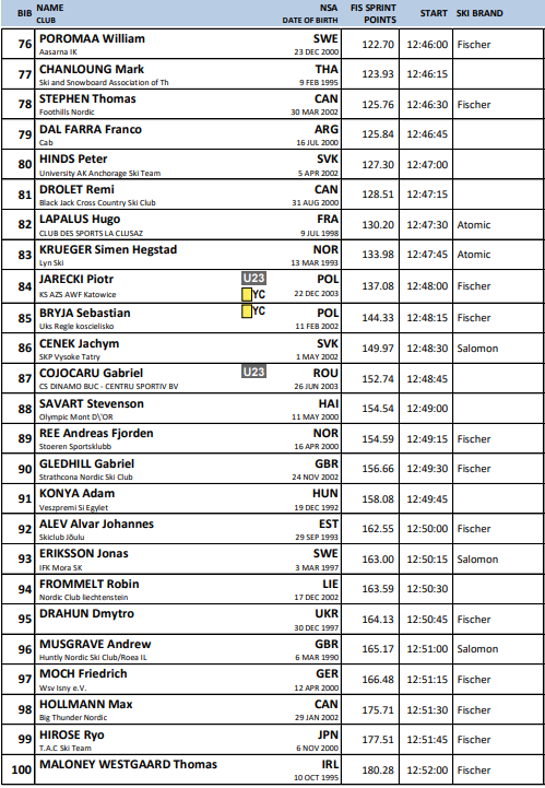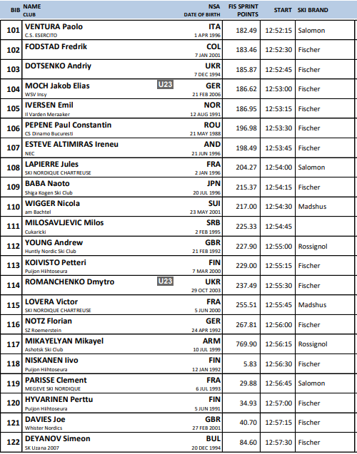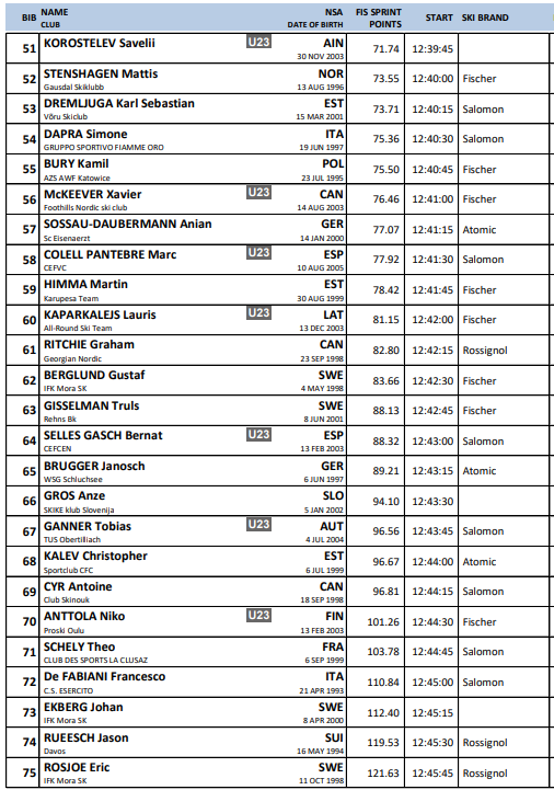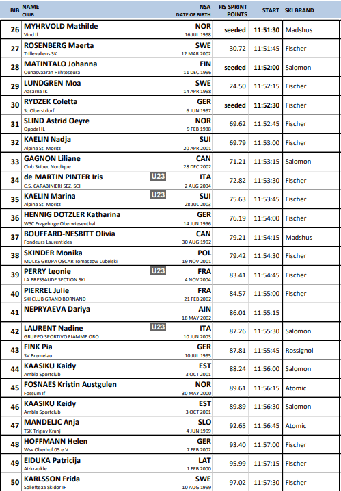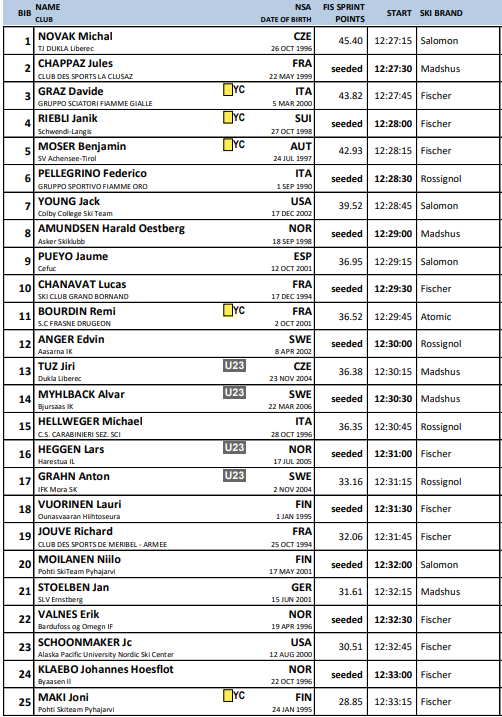 Startlister og resultater for sprint fri som er etappe 1 av Tour de Ski 2025-2026 som arrangeres i Toblach 28. desember 2025.