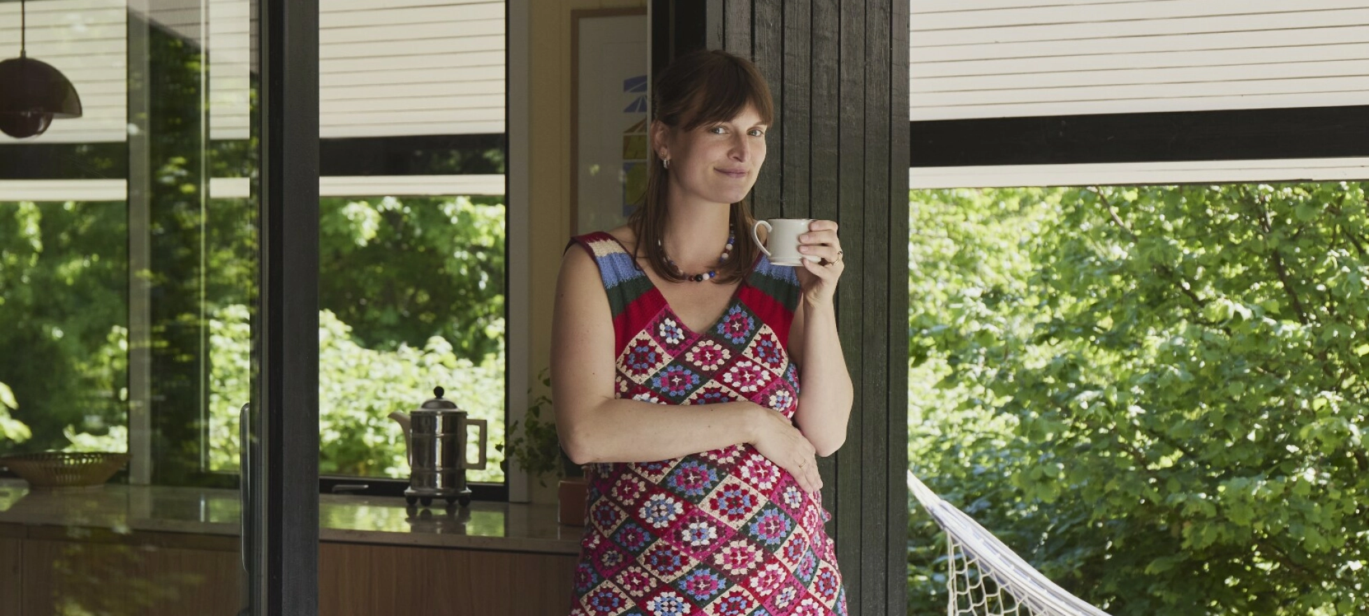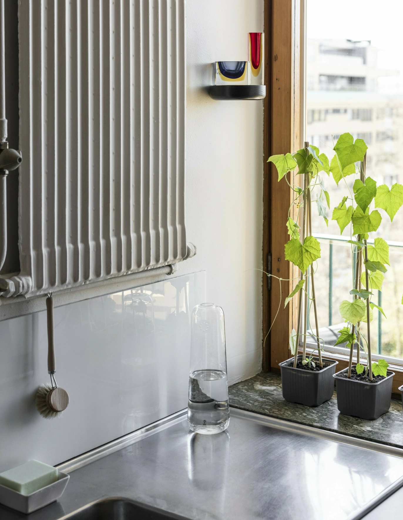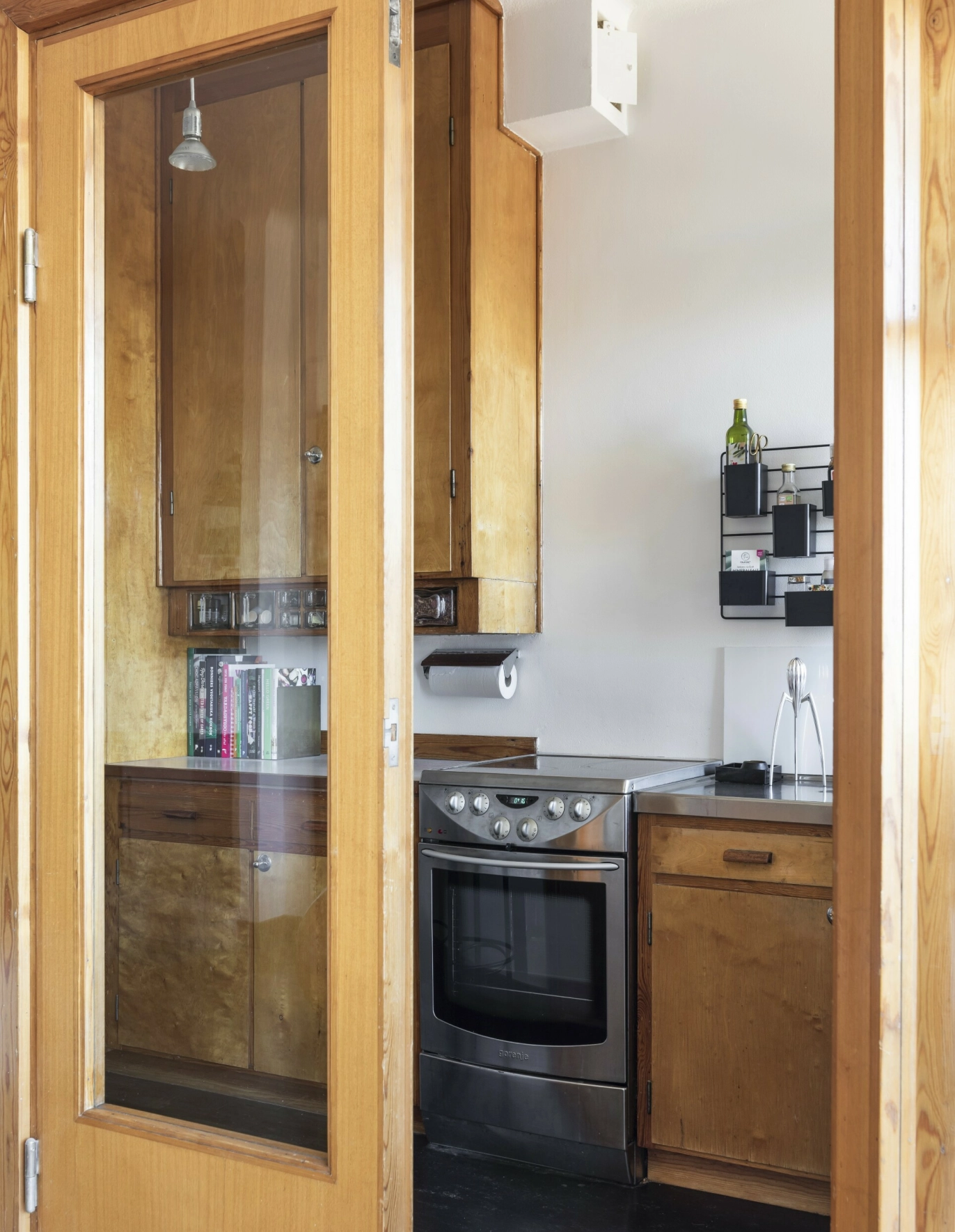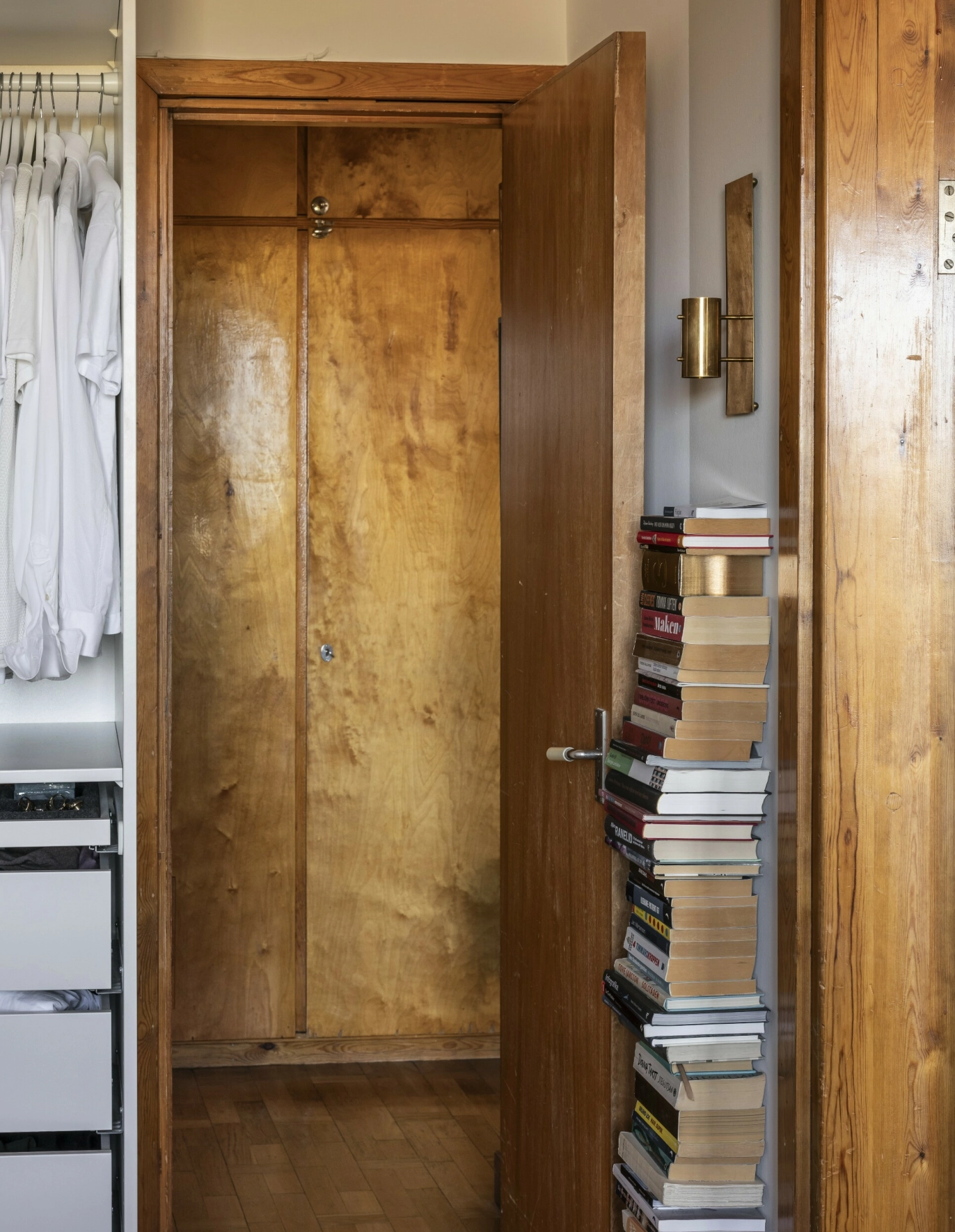 Det er som om leiligheten er skapt for lys. Solen maler rommene, stryker over de hvite og grå veggene, smyger seg på skrå inn i uventede hjørner og legger seg som stille varme på alt her inne. Overalt ser man lakkert treverk. I mer enn 80 år har solen gitt det et ravdypt skjær – på garderober, dører, kjøkkenfronter, karmer og lister – som gamle instrumenter med patina. Alt er gjennomtenkt.