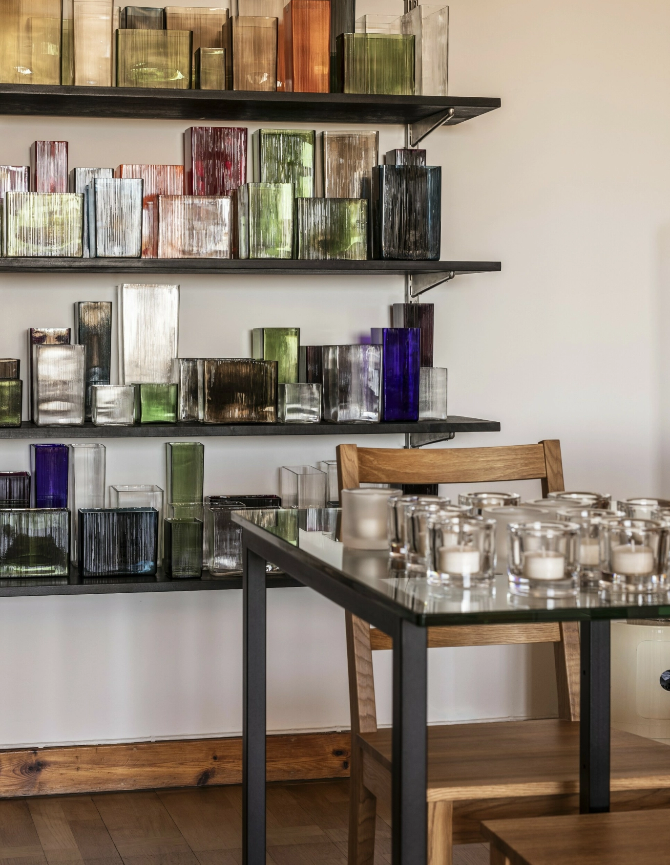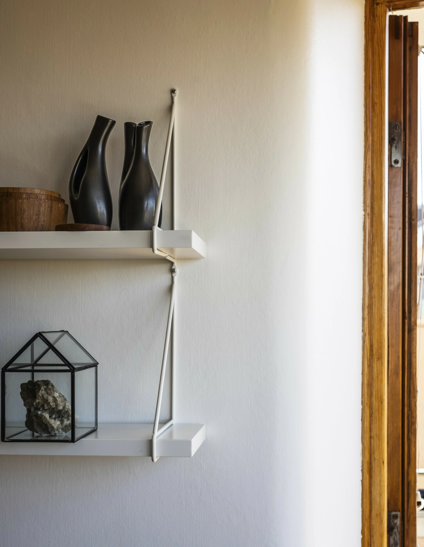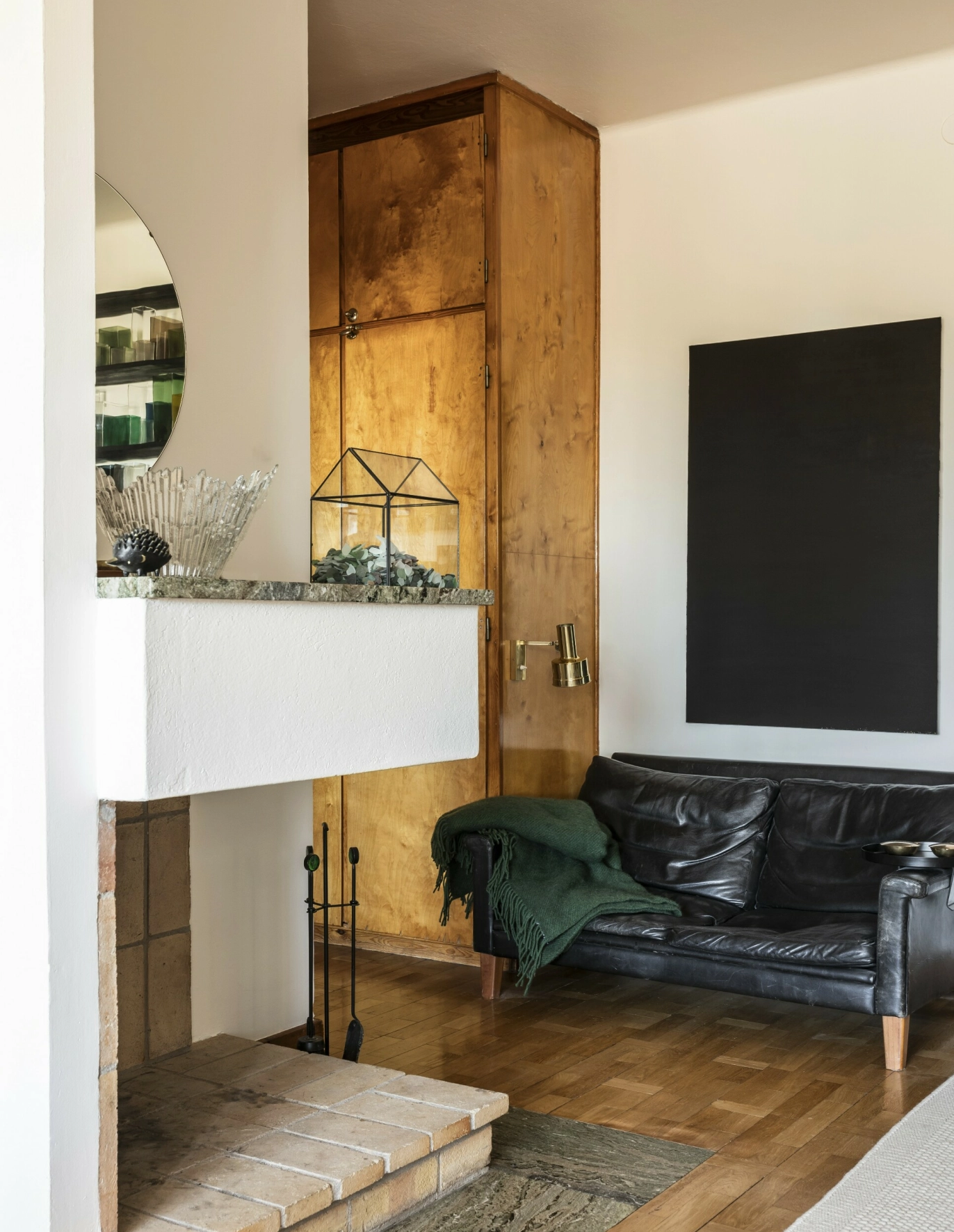 Henrik har innredet rommene sine med ulike energier. 1940-tallets solide grunn møter dagens materialer og design. En dempet sofa står i kontrast til Eero Arnios poppete Pastill-stol i knalloransje plast og et kullsvart maleri. En svart skinnsofa vender seg mot den åpne peisen og er et sted for lange kvelder. Et rolig soverom er malt med perlegrå eggoljetempera helt opp i taket. Samlingene hans ligger som små øyer rundt om i hjemmet: messinglysestaker, prismer, keramikkfugler. Innerst glitrer hundre glassvaser som en installasjon i nøye avstemte farger.