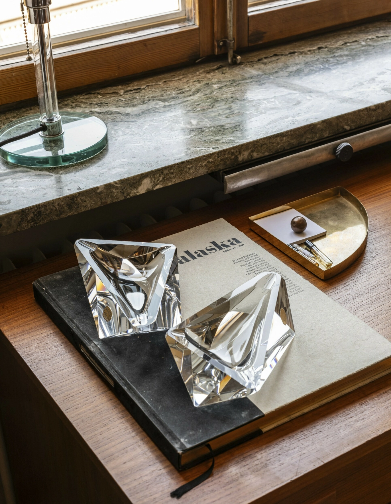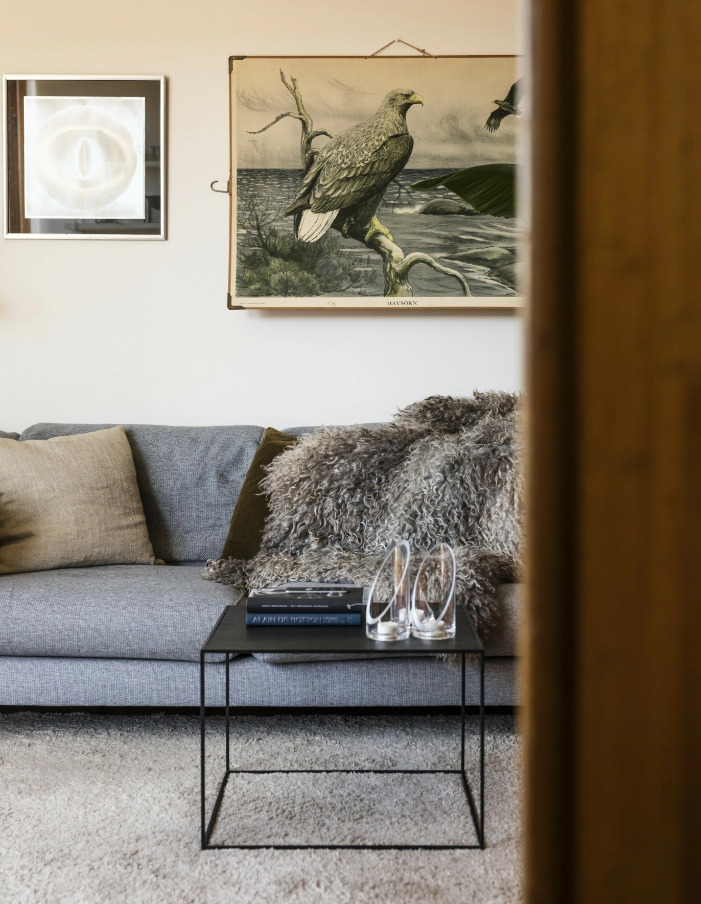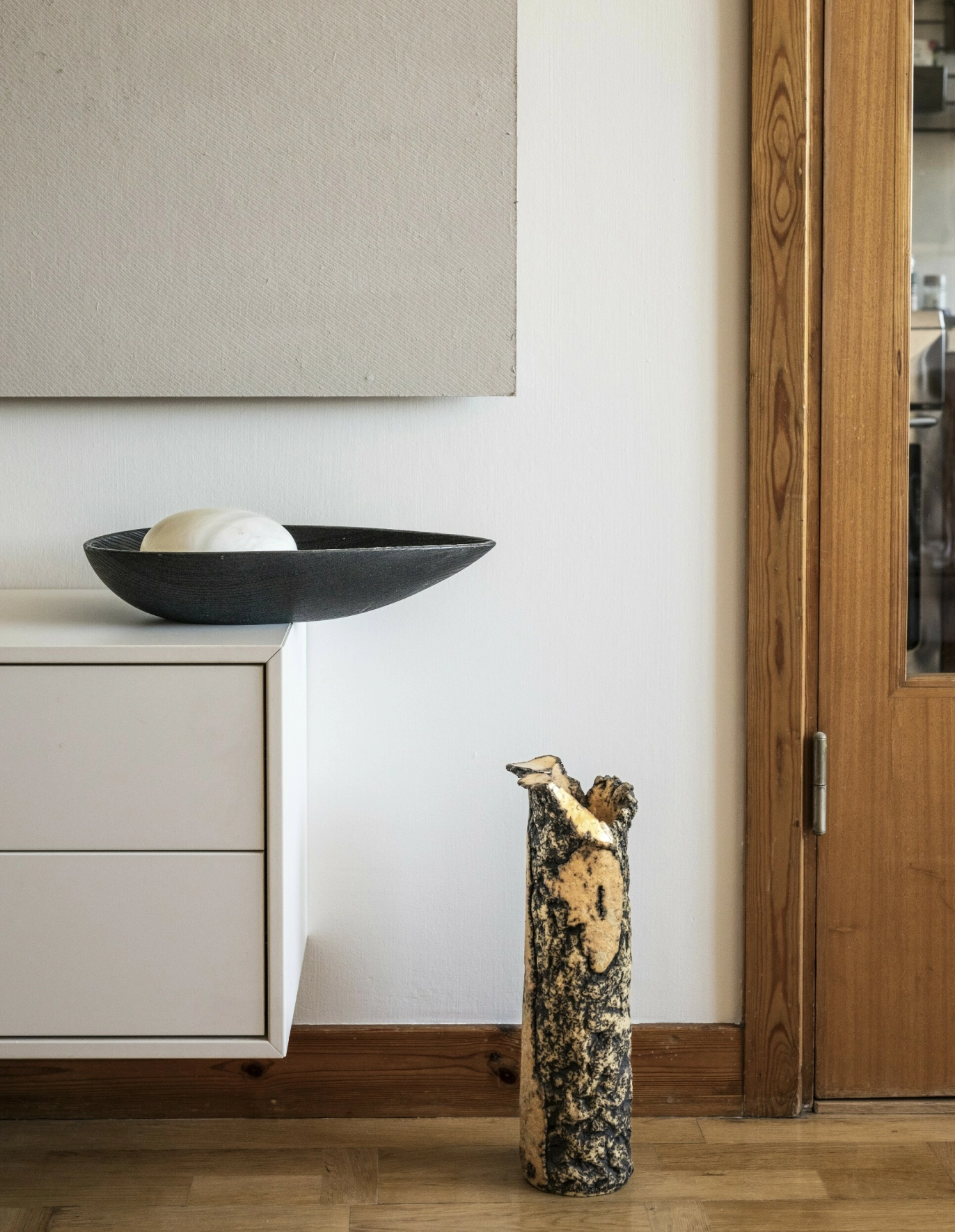 Henrik har innredet rommene sine med ulike energier. 1940-tallets solide grunn møter dagens materialer og design. En dempet sofa står i kontrast til Eero Arnios poppete Pastill-stol i knalloransje plast og et kullsvart maleri. En svart skinnsofa vender seg mot den åpne peisen og er et sted for lange kvelder. Et rolig soverom er malt med perlegrå eggoljetempera helt opp i taket. Samlingene hans ligger som små øyer rundt om i hjemmet: messinglysestaker, prismer, keramikkfugler. Innerst glitrer hundre glassvaser som en installasjon i nøye avstemte farger.