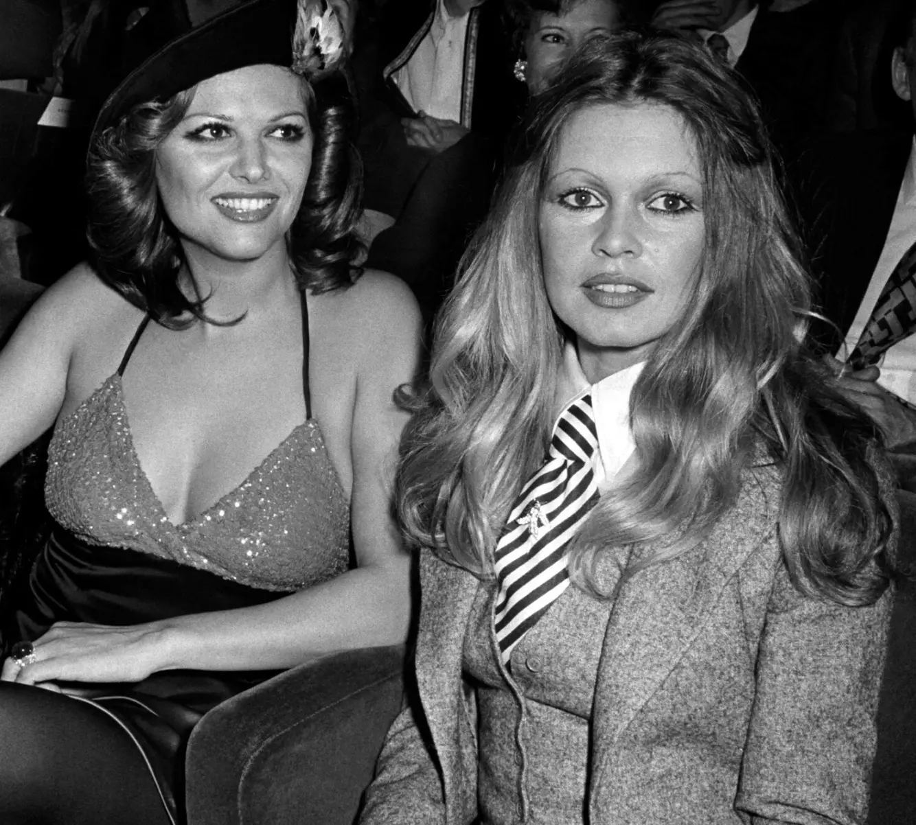 SUPERKJENDIS: Den franske skuespillerinnen Brigitte Bardot (høyre) og den italienske skuespillerinnen Claudia Cardinale (venstre) på premieren av filmen «Les Petroleuses» i 1971. Foto: AFP / NTB