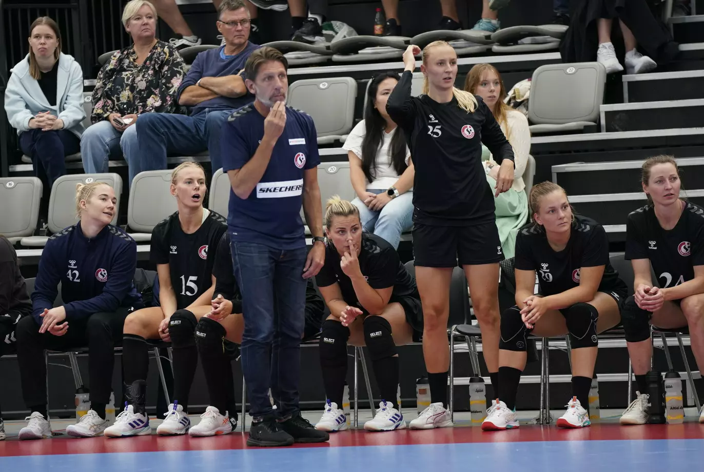 KOLLAPS: Henny Reistad (stående til høyre) på Esbjerg-benken under en treningskamp i sommer. Mellom henne og trener Tomas Axnér, sitter Nora Mørk. Foto: John Terje Pedersen / Dagbladet